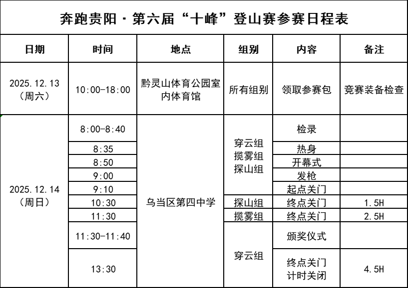 根据贵阳市乌当区气象局发布的寒潮预警,赛事日(12月14日)清晨气温将骤降,最低达-2~2℃,且赛道路面存在霜冻、湿滑风险。赛事组委会基于天气情况及赛道环境特点,对本次赛事竞赛装备清单进行了调整更新,请所有参赛选手仔细阅读并严格遵守。