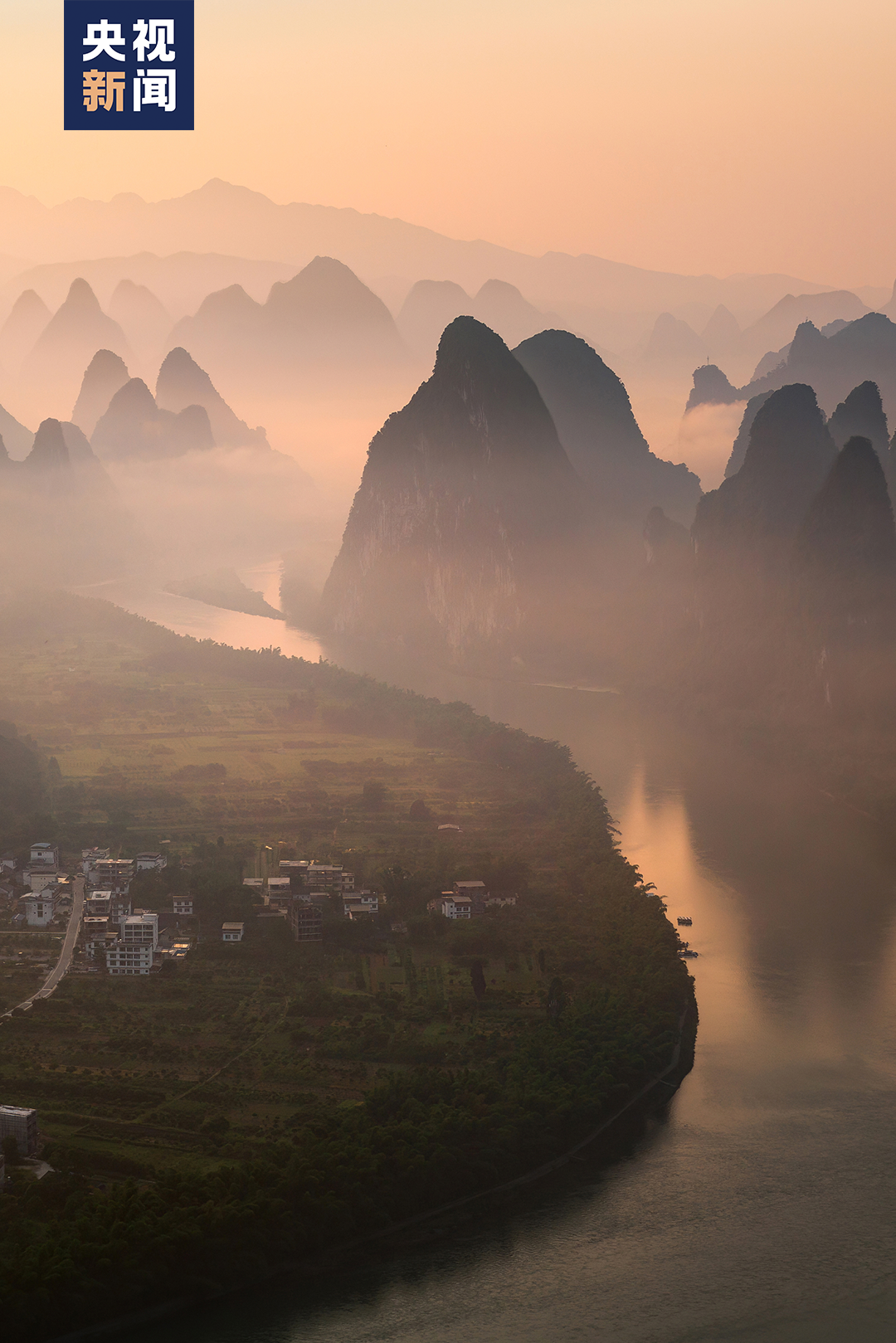 漓江酷似一条青罗带,蜿蜒于万点奇峰之间,桂林山水的秀美,被唐代诗人韩愈一句“江作青罗带,山如碧玉簪”写尽。