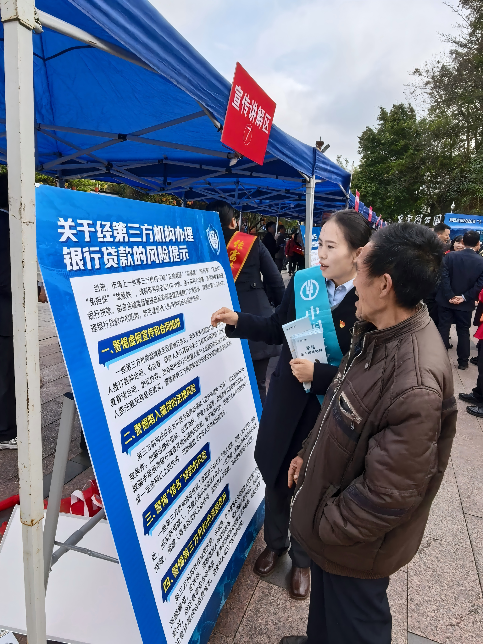 活动现场,农行黔西南分行工作人员立足群众金融需求,围绕日常金融消费中高频出现的风险陷阱开展精准科普宣讲。针对群众易接触的“高收益”理财产品,深入剖析其背后潜藏的非法集资隐患,拆解虚假宣传套路;对第三方贷款中介巧立名目收取高额费用的欺诈行为,逐一揭示其违法本质,引导群众拒绝非法中介;明确指出“征信修复”纯属骗局,提醒群众通过正规渠道维护自身征信权益。