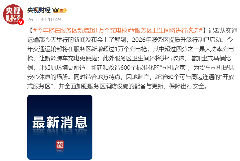 1月30日,据央视财经:记者从交通运输部今天举行的新闻发布会上了解到,2026年服务区提质升级行动已启动。