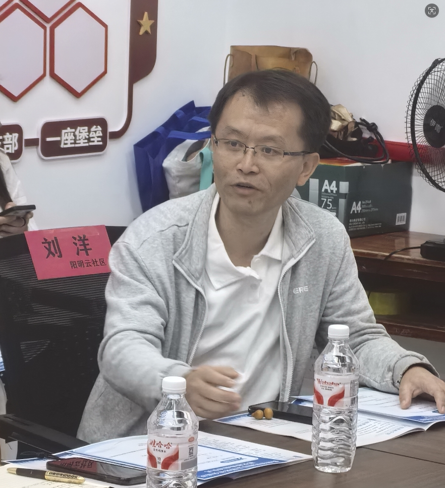 在主题分享环节,阳明云社区刘洋老师作为一线实战专家,结合自身经验分享社区服务心得,并对未来半年公益事业规划提出建议。