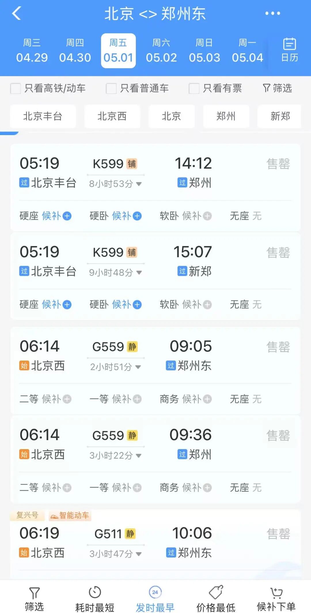 ▲12306App上5月1日北京到郑州的火车票售卖情况。