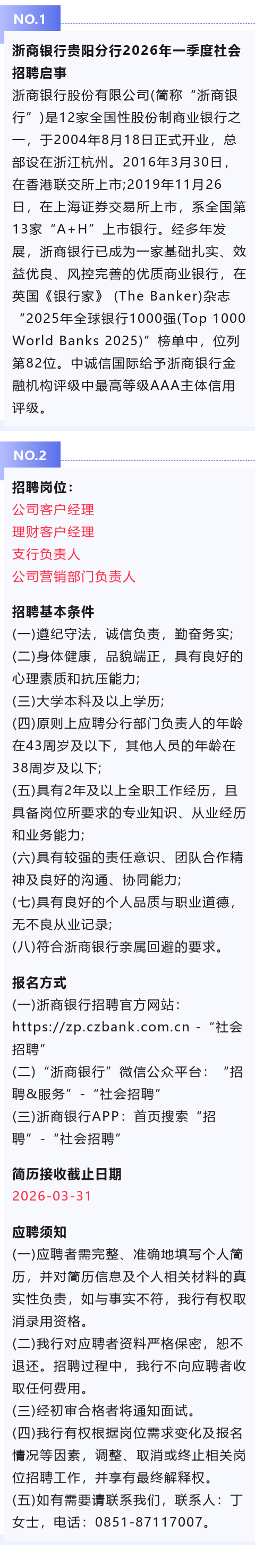 浙商银行贵阳分行4岗招聘!报名截止时间:3月31日!