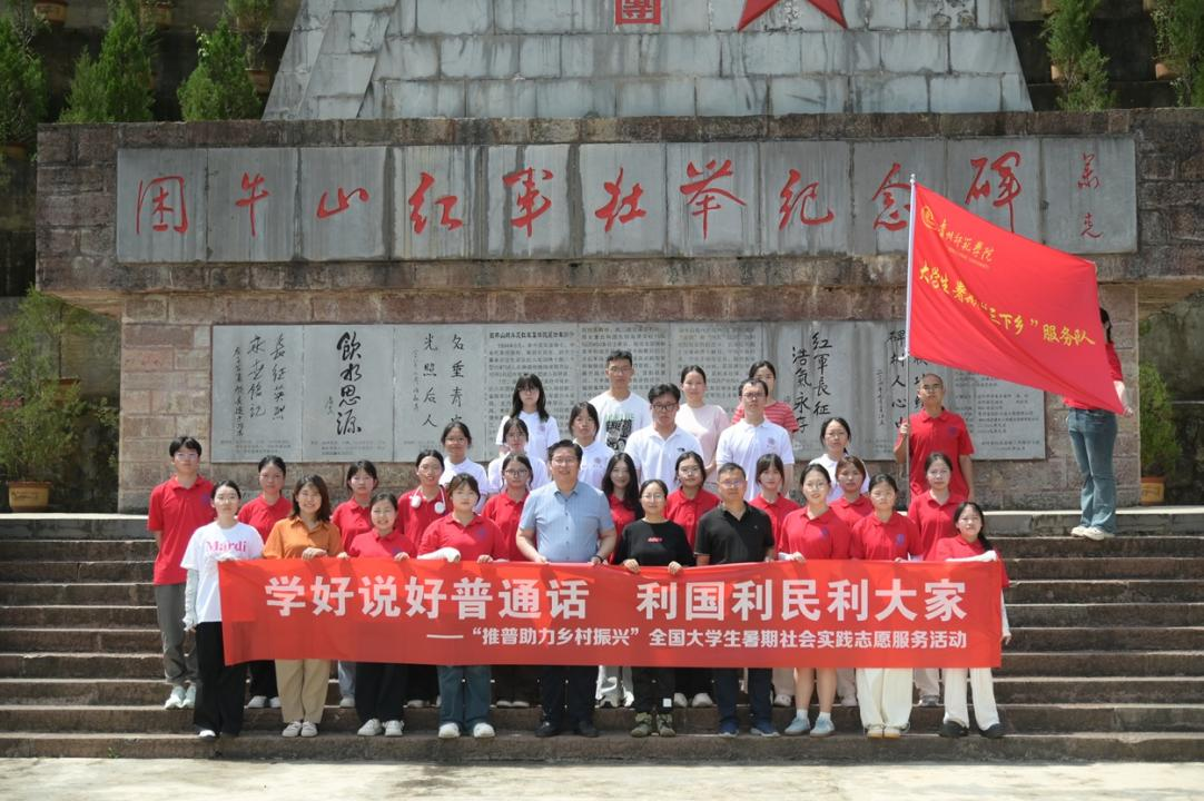 贵州师范学院注重跨省校际合作,提升推普活动的广度与深度。文学与传媒学院“知音”黔行实践队与苏州大学文学院再度携手,在石阡县困牛山红军学校开启联合推普实践活动。启动仪式上,两院学子庄严接过团县委授予的队旗,标志着跨省校际推普合作迈入新阶段。通过红色文化传承与普通话推广双向赋能,探索出“红色基因-通用语言”相结合的特色模式。两校学子共同重走红军跳崖路、参观展陈中心、协助培训“小红星讲解员”,在革命传统教育中深化对语言价值的理解。
