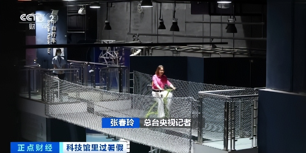 总台央视记者 张春玲:我为大家表演的是空中蹬自行车走钢丝,我的奥秘就在自行车下方一个非常重的物体上,通过它的配重,我的重心变得非常低,所以会保持一个稳定的状态。即便在上面左右晃动,都是非常平稳的。