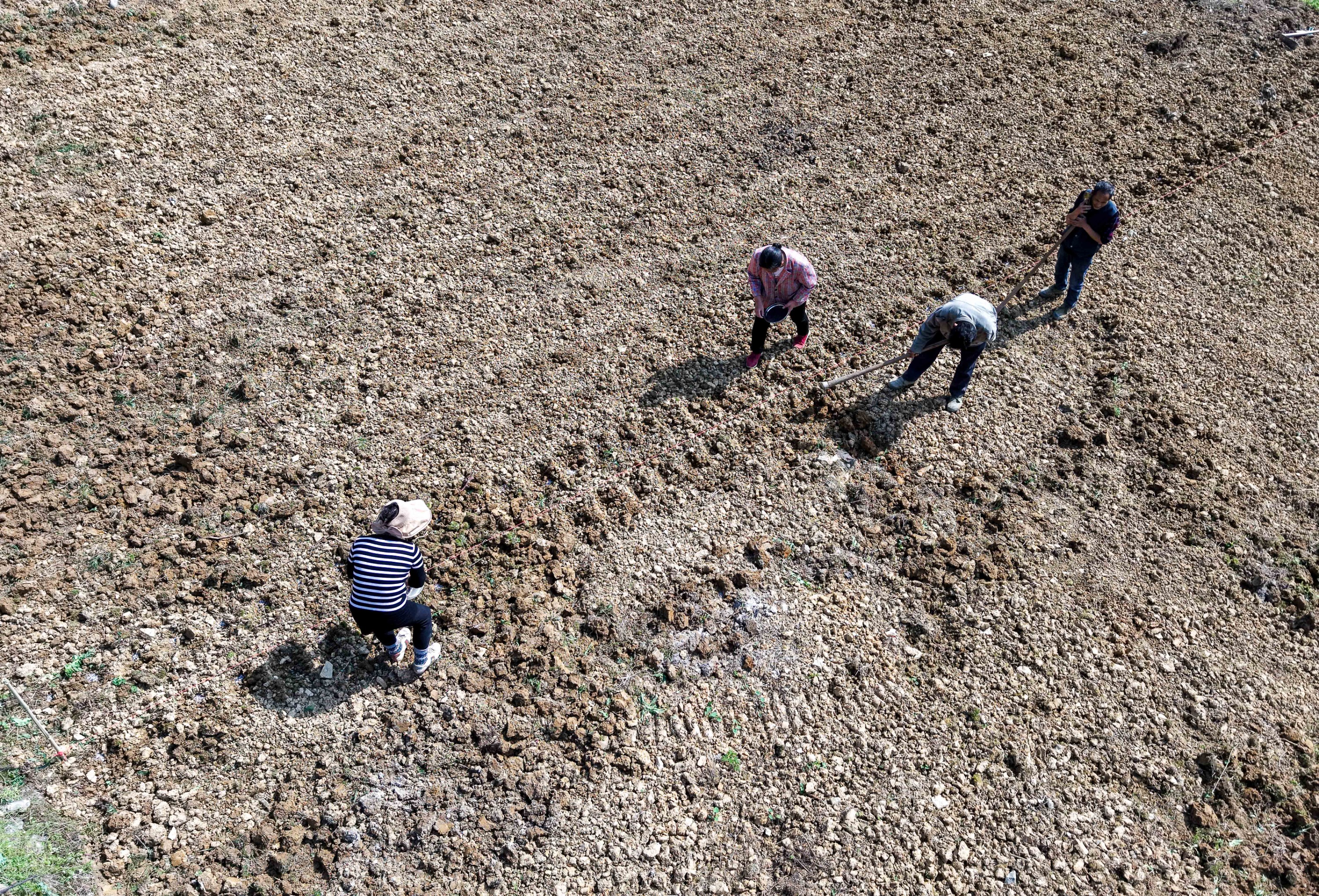 4月7日,村民在道真自治县河口镇梅江村高粱种植基地劳作。 (无人机照片)