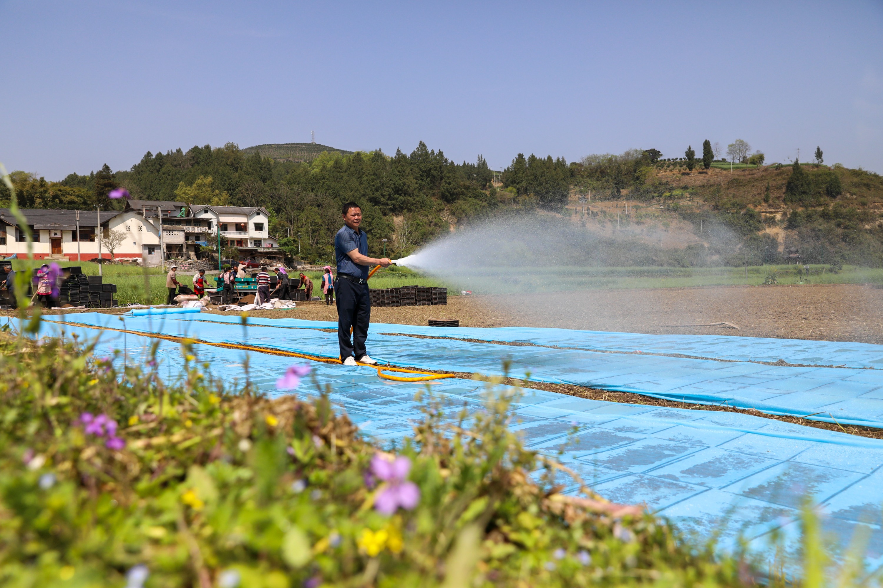 4月7日,村民在道真自治县河口镇梅江村水稻种植基地为苗盘洒水。