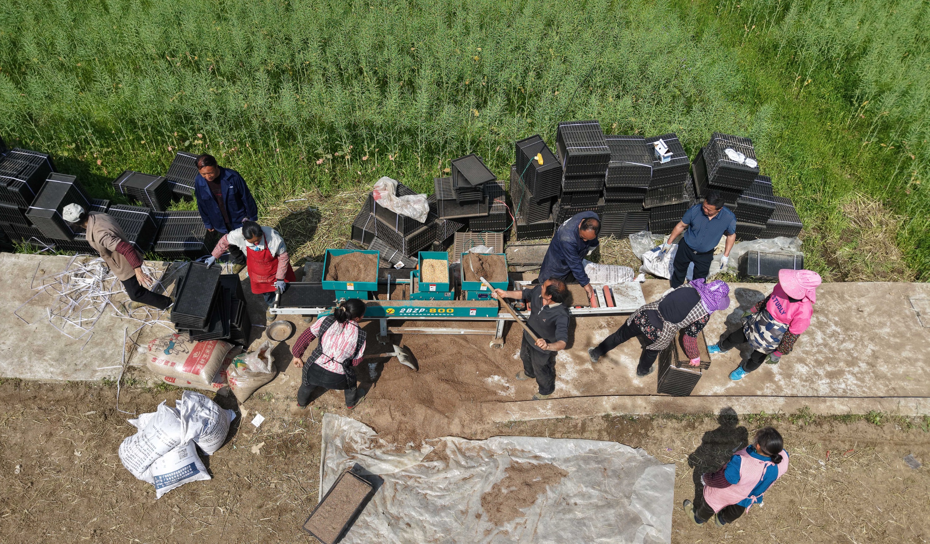 4月7日,村民在道真自治县河口镇梅江村水稻种植基地用育苗播种机播种。(无人机照片)
