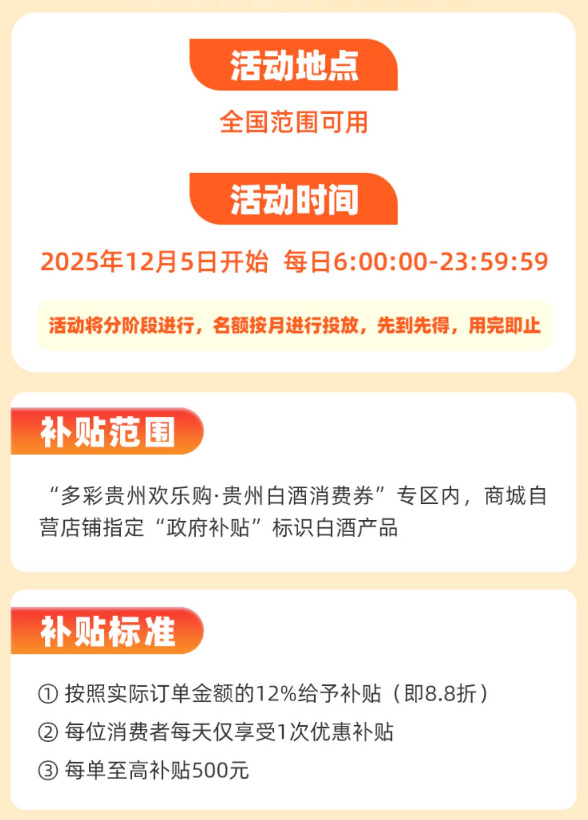 即日起,全国消费者只需登录“一码贵州”平台,进入“贵州白酒消费券专区”,即可在选购心仪黔酒的同时,直接享受政府与平台联合提供的购酒补贴。据悉,本次消费券活动将持续至2026年3月31日。本次活动秉承惠民便民的宗旨,采用“无需领券,支付立减”的方式,优化了消费者的使用体验。活动期间,消费者在一码贵州平台“贵州白酒消费券专区”购买商城自营店铺指定“政府补贴”标识白酒产品,通过“云闪付”完成支付时,系统将自动核算并抵扣相应补贴金额。每位消费者每日可享受一次优惠,单笔订单最高可享500元补贴。活动覆盖全国用户,补贴名额将按月进行投放,先到先得,用完即止。