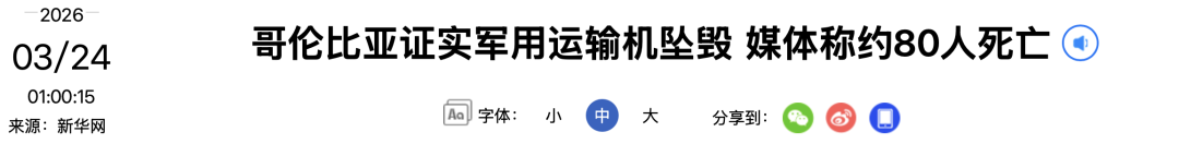 哥伦比亚证实军用运输机坠毁,媒体称约80人死亡