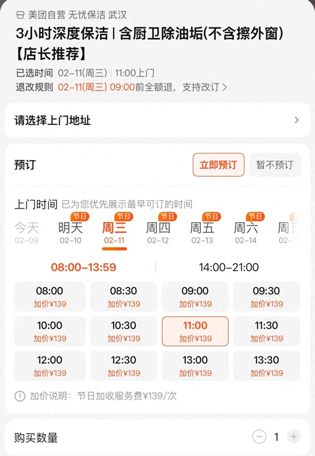 相比之下,部分全国性平台的自营业务涨幅更大。自如家政的工作人员透露,其所在平台对日常保洁服务统一加收30元清洁工费,2月14日后加价100元,这已是市场中较低的涨幅。九派新闻注意到,美团自营保洁服务单次加价已达139元。
