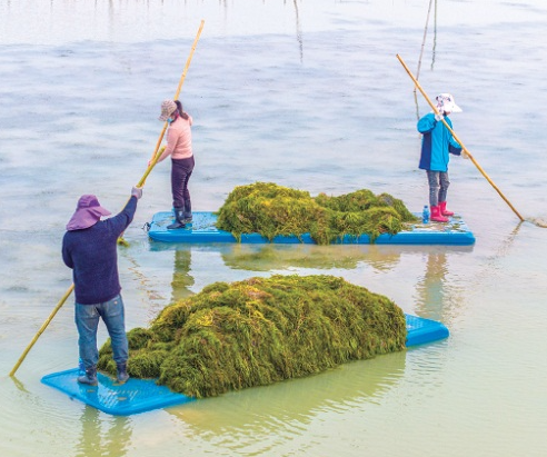 近日,在江苏省宿迁市泗洪县临淮镇的螃蟹养殖塘口,蟹农正在打捞伊乐藻。这批水草将销往周边养殖区,既给蟹塘“减负”净化水质,又为蟹农开辟了新的增收路径,实现了生态与经济双丰收。周鹏 摄(来源:大国三农)
