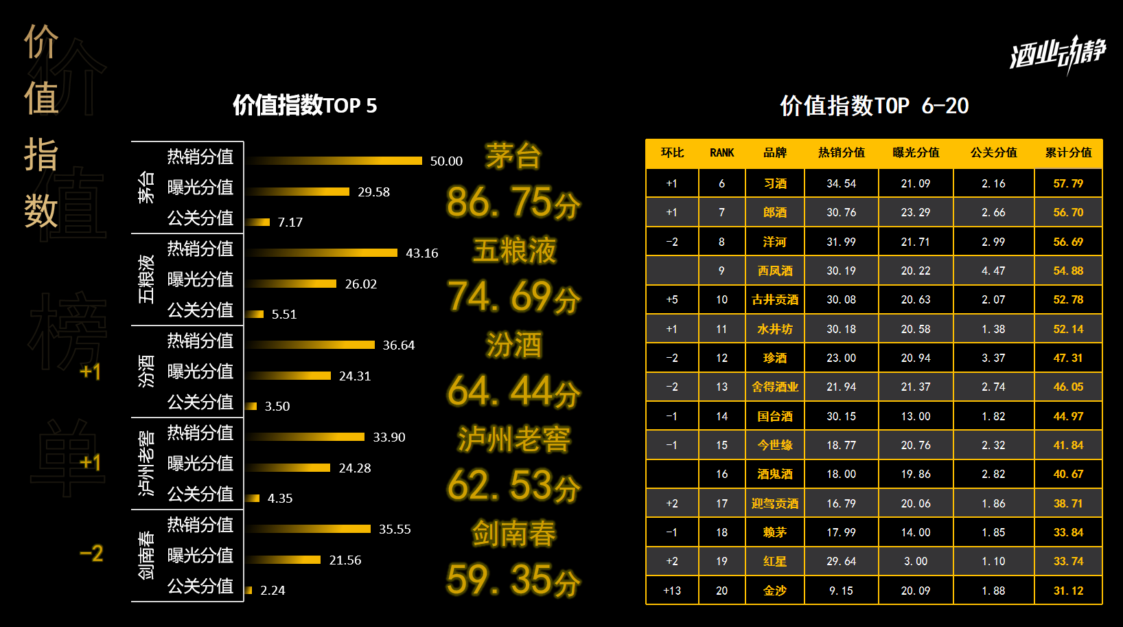 综合营收、公关、曝光三大维度的价值指数榜单,茅台以86.75分展现了无懈可击的霸主地位。五粮液排名第二,分值为74.69。