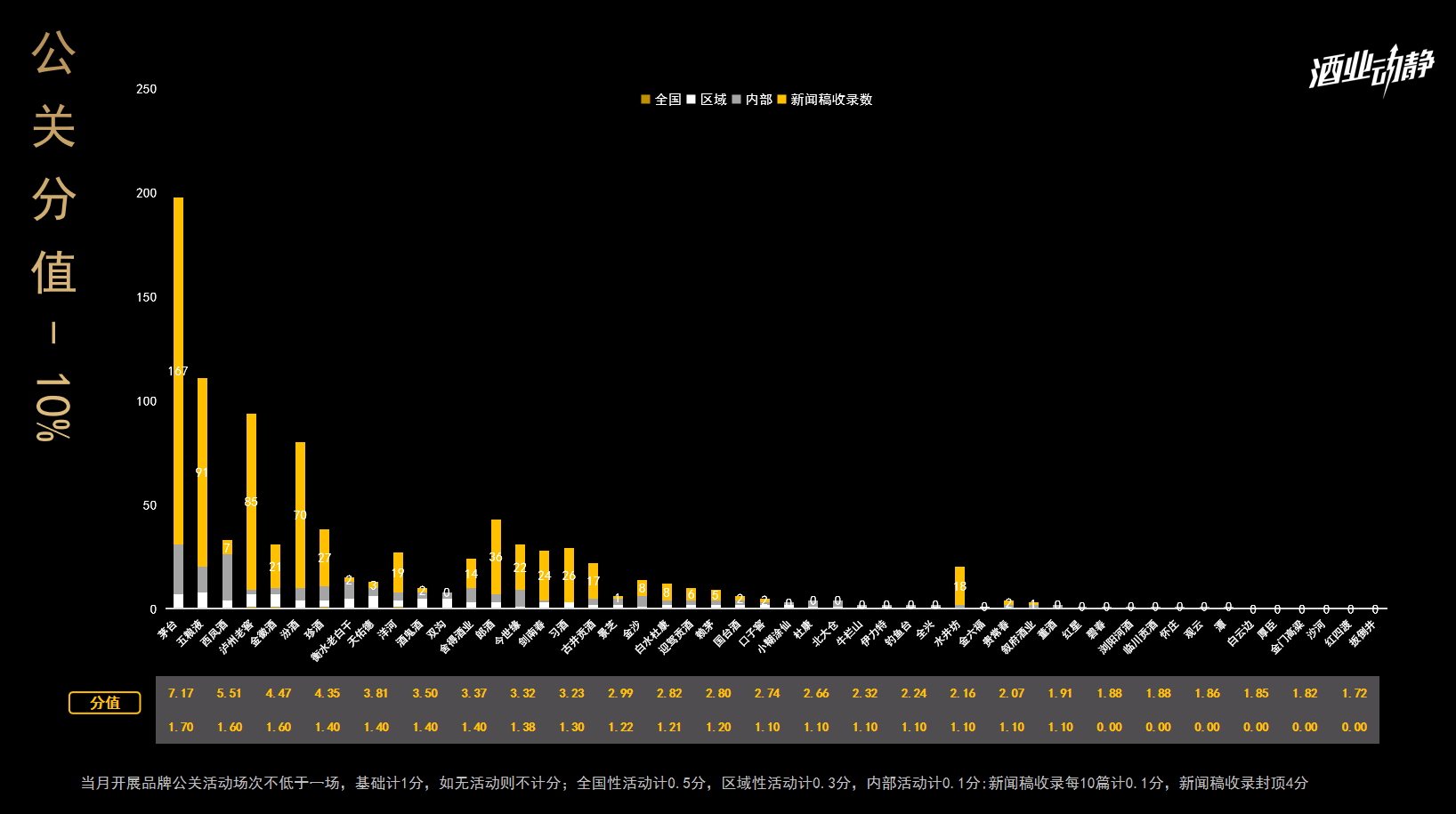 整体来看,多数酒企的公关分值分布于2–4分之间,说明行业当前仍以清库存、促回流为主要目标,品牌建设投入普遍保守。