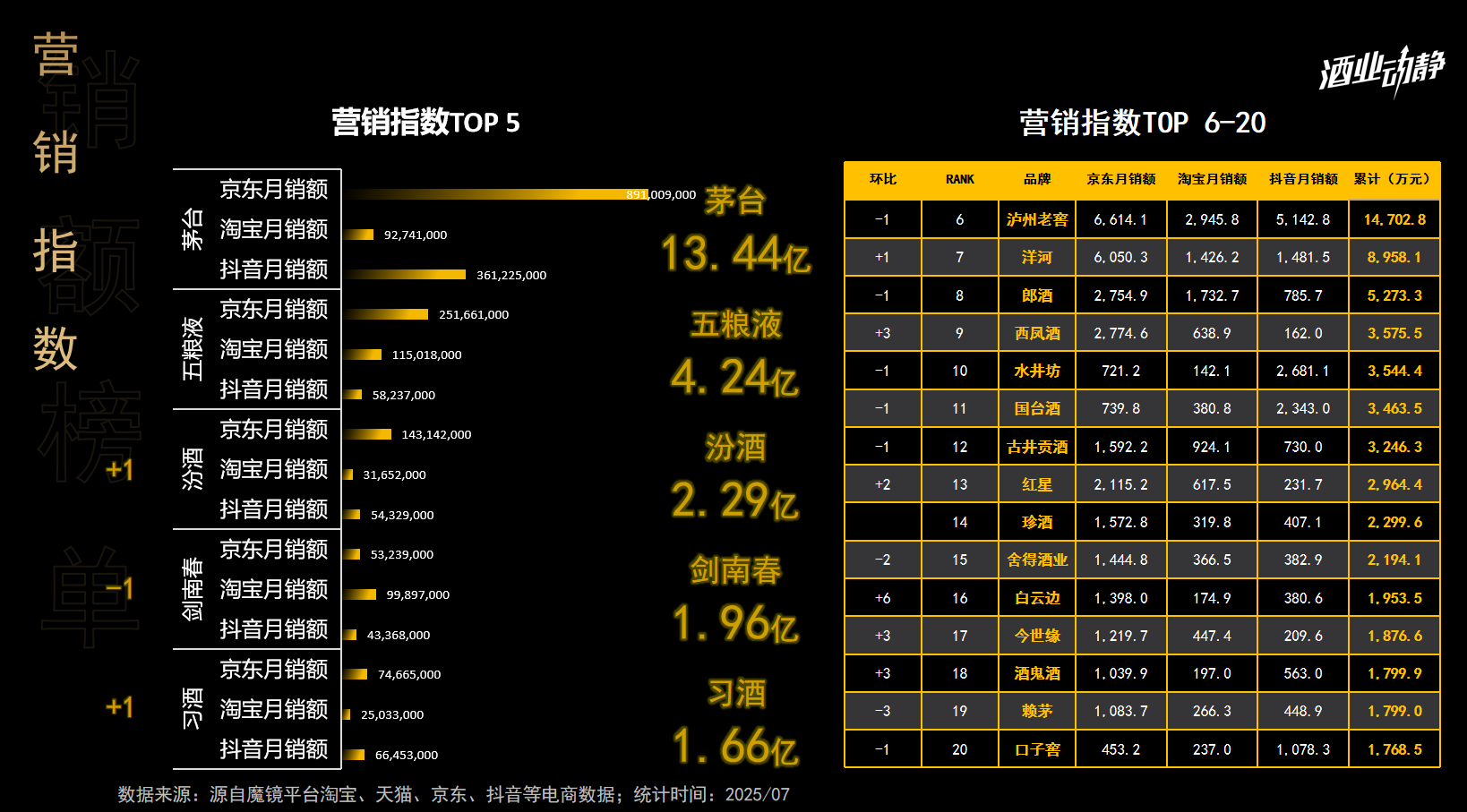 7月,中国白酒市场步入传统销售淡季,行业呈现显著分化态势。茅台、五粮液、汾酒、剑南春与习酒五大头部品牌在主流电商平台共创23.59亿元销售额,而第六至第二十名品牌的销售额多集中于3000–8000万元区间,差距悬殊,反映出当前调整期内市场资源向名酒品牌集中的“马太效应”。