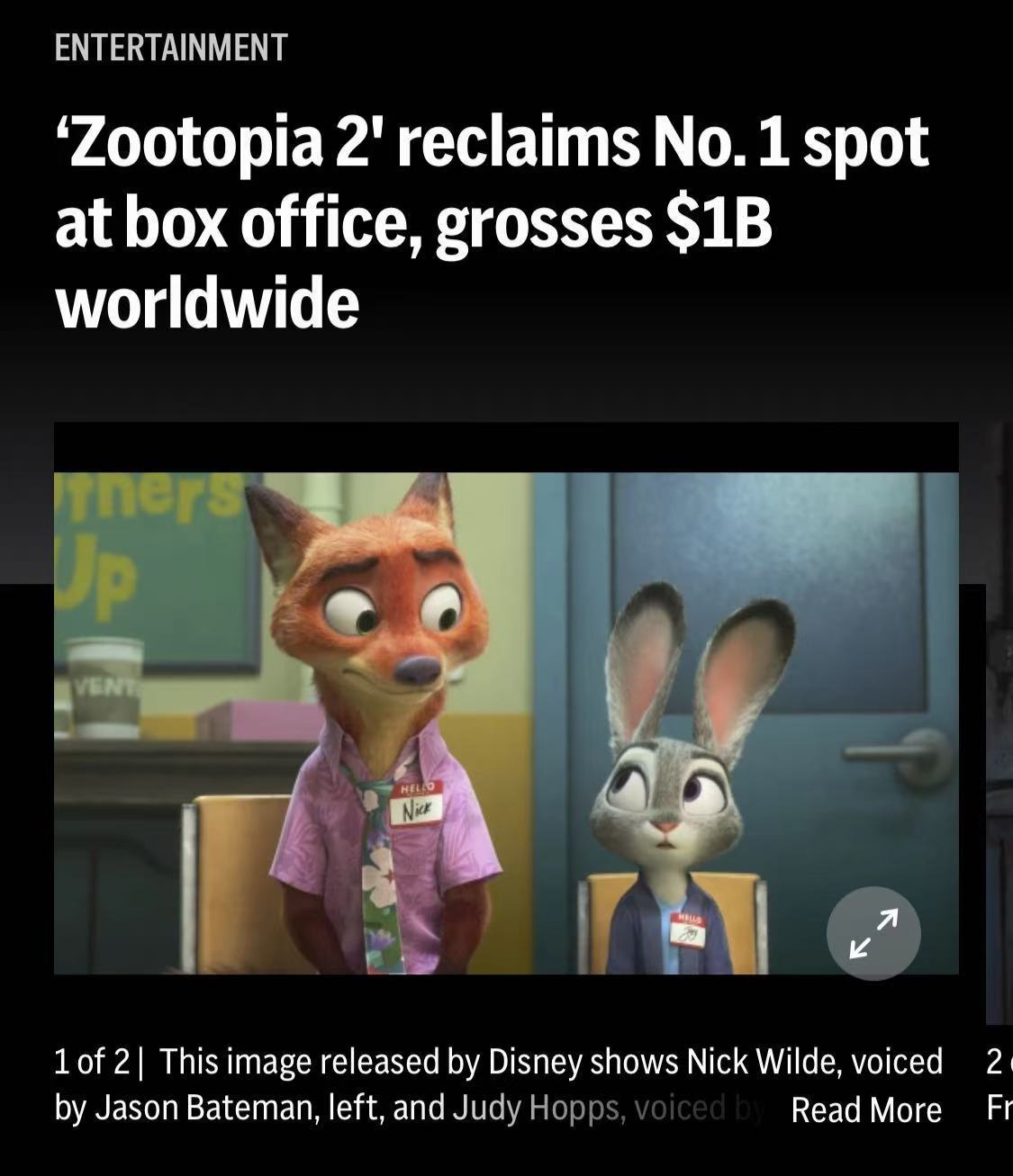 美联社则在北美周末票房报道中强调,《疯狂动物城2》全球票房突破10亿美元的成绩主要由海外市场推动,其中中国市场贡献突出,并披露该片在中国票房约为5.024亿美元,对其全球表现意义重大。分析认为,对于体量较大的商业大片而言,中国市场的票房贡献已能够与美国本土市场相媲美,甚至在部分情况下实现超越,从而深刻改变影片的全球收益结构。
