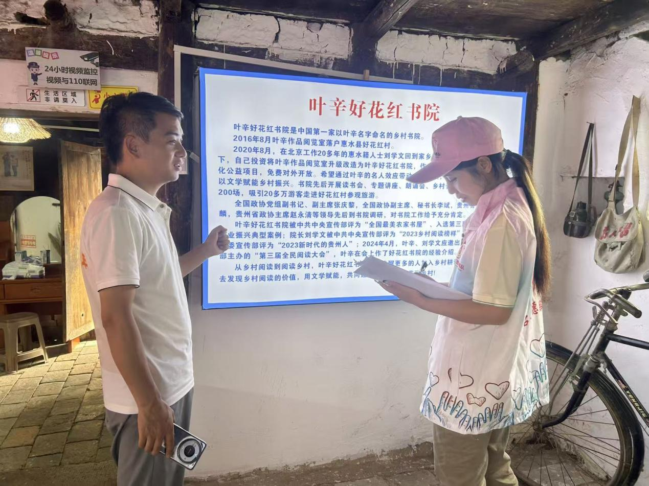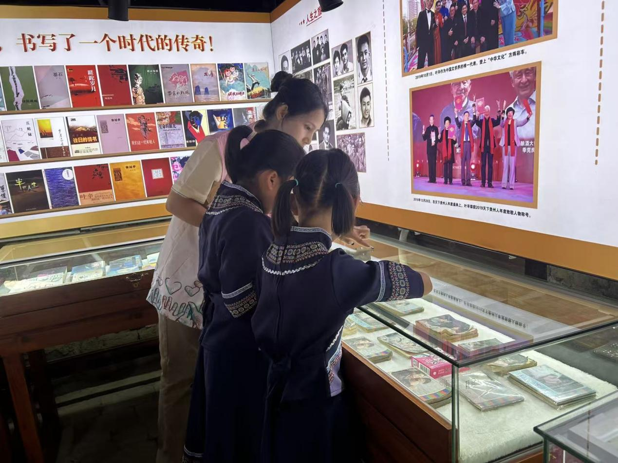 进入好花红书院后,贵州贵联公益服务中心理事长张新春介绍,2018年叶辛主席创办书院时特设“民族文化展示区”。现场展出的“上海牌”帆布包、煤油灯等叶辛旧物,附有布依群众帮其维修养护的说明,见证知青与当地群众情谊。在书籍展示馆,学子们分段朗读收录布依“六月六”“三月三”民俗的《黔山听语》,志愿队结合陈列的苗族银饰、布依枫香染,讲解“六月六”节日内涵,帮学子建立“各民族文化共生共荣”认知。