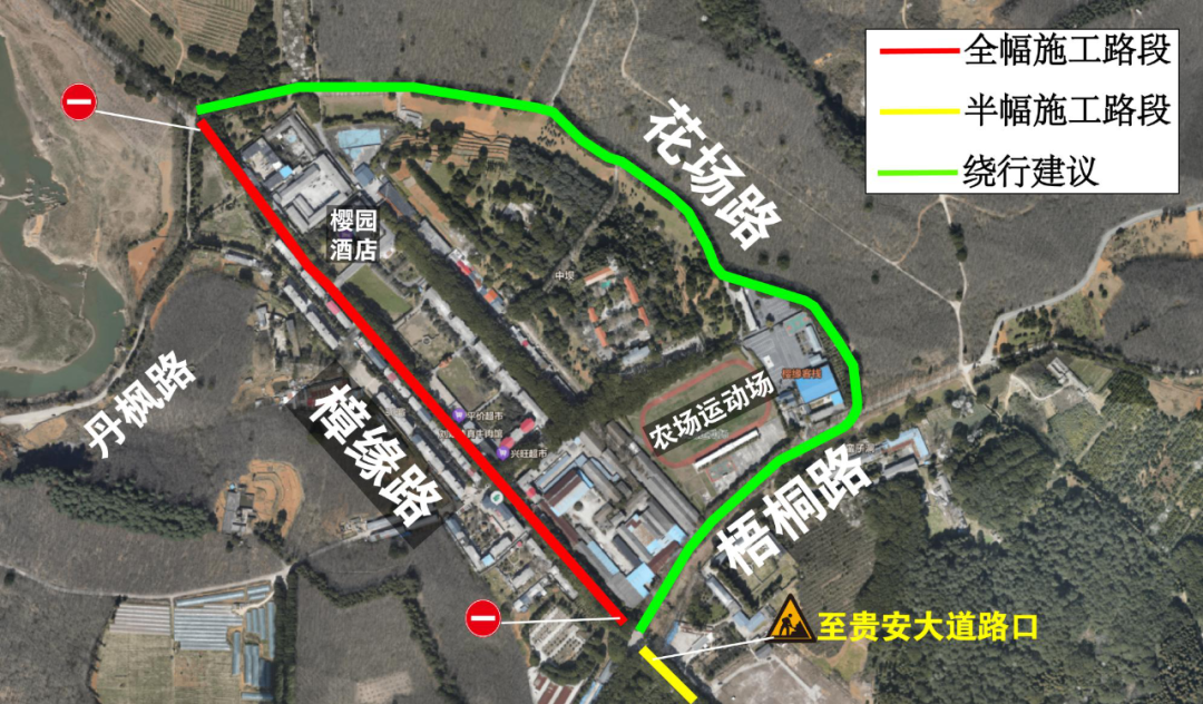 樟缘路全幅施工路段:樟缘路与梧桐路交叉口(平坝监狱路口)至花场路交叉口。