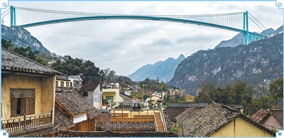 贵州贞丰县平街乡花江村,花江峡谷大桥与村寨相映成画。 张 帆摄(影像中国)