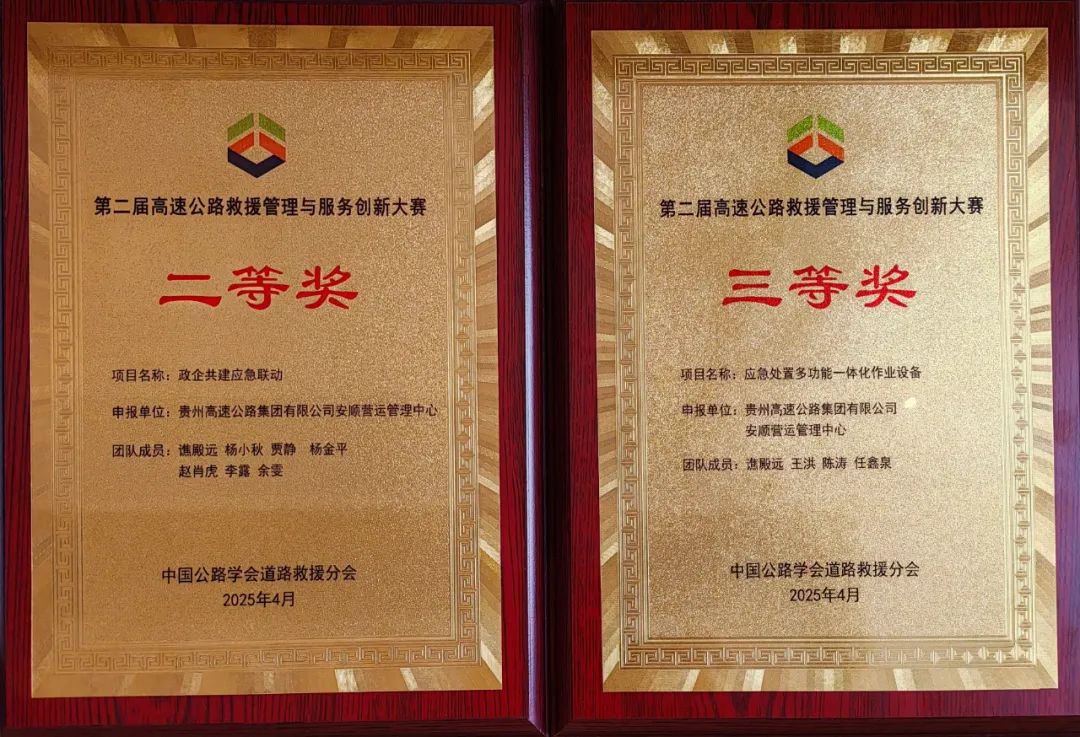 近日,中国公路学会第二届高速公路救援管理与服务创新大赛举行,贵州高速集团安顺营运中心在全国高速公路救援领域崭露头角,“政企共建应急联动”项目荣获二等奖,“应急处置多功能一体化作业设备”项目荣获三等奖。