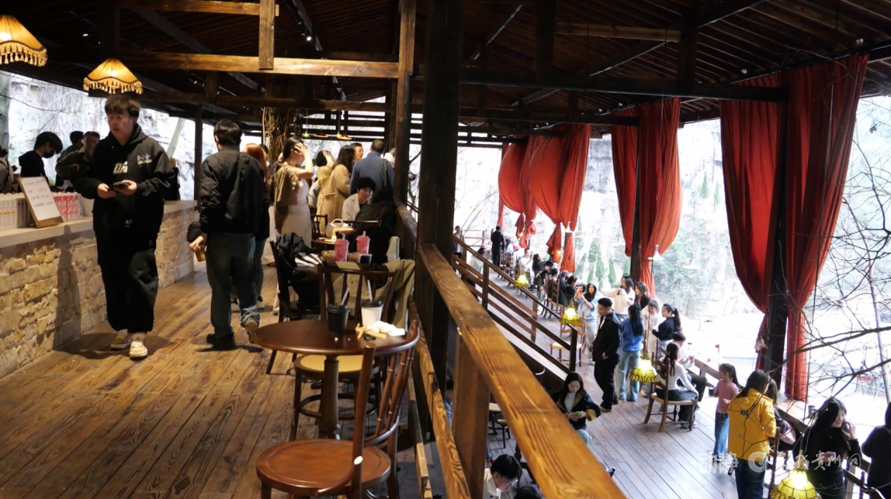 洞内,咖啡醇香弥漫,舒缓音乐轻轻流淌;洞外,游人沿瀑布步道缓步而行,沉醉在山野美景之中。天然溶洞的独特肌理与精心打造的休闲空间相得益彰,飞瀑流水叮咚作响,与游人欢声笑语交织共鸣,这份独一无二的沉浸式体验,让前来打卡的游客赞不绝口。