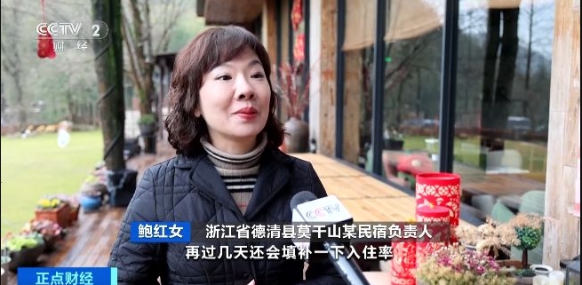 浙江省德清县莫干山某民宿负责人 鲍红女:今年春节的预订量达到80%左右,再过几天还会填补入住率。春节期间房间价格基本在1200元以上,比平时有50%左右的上涨。