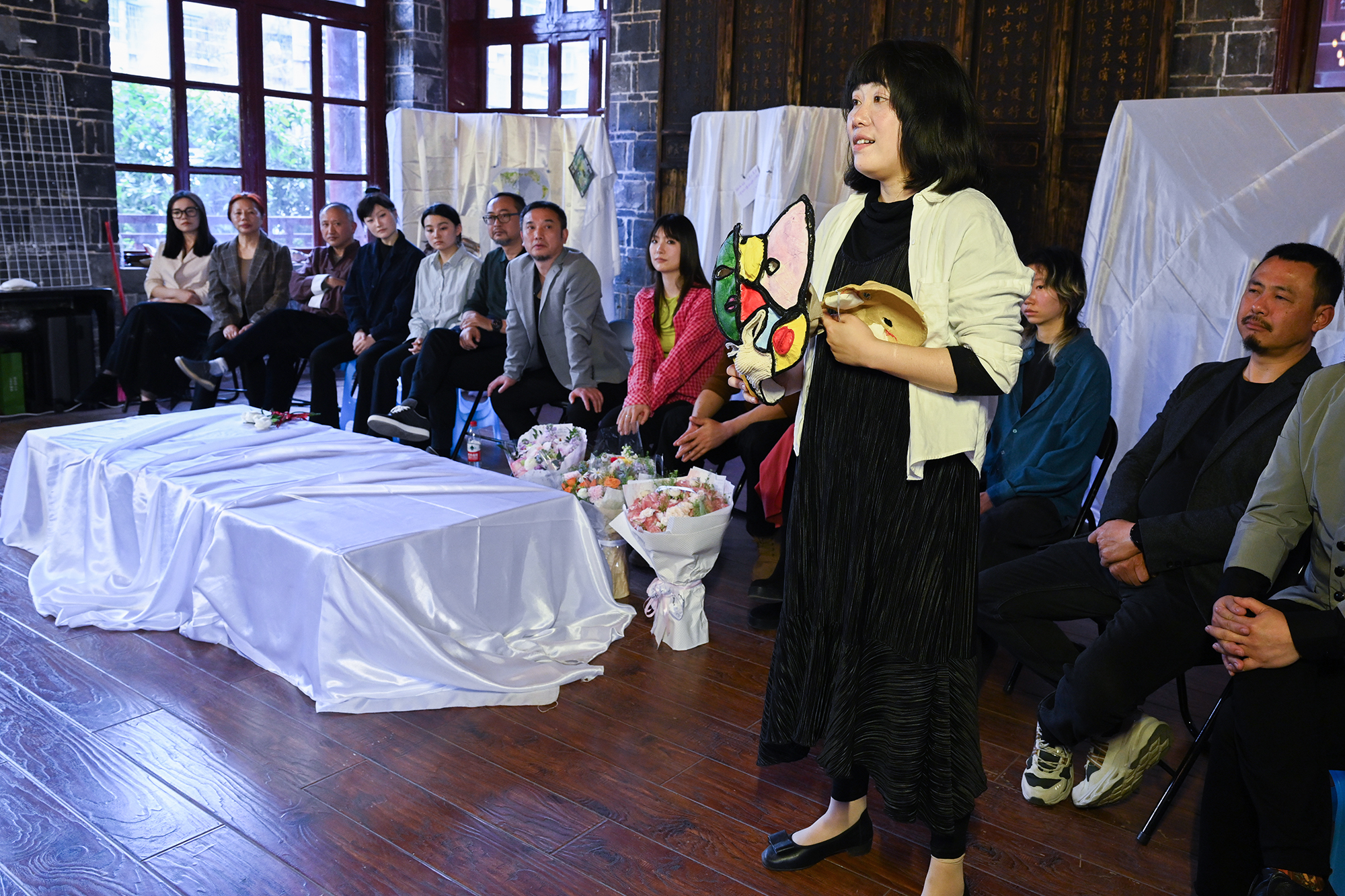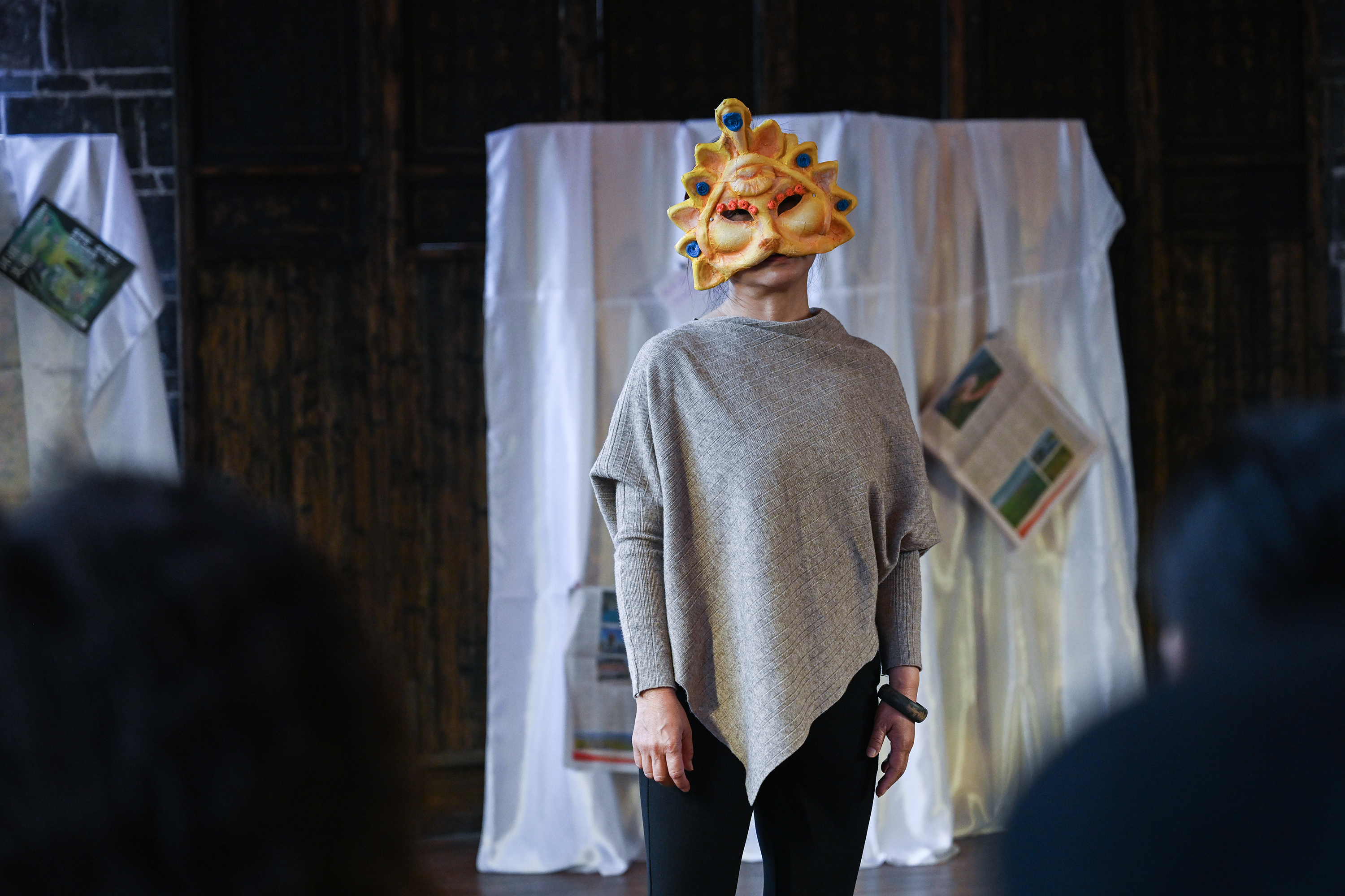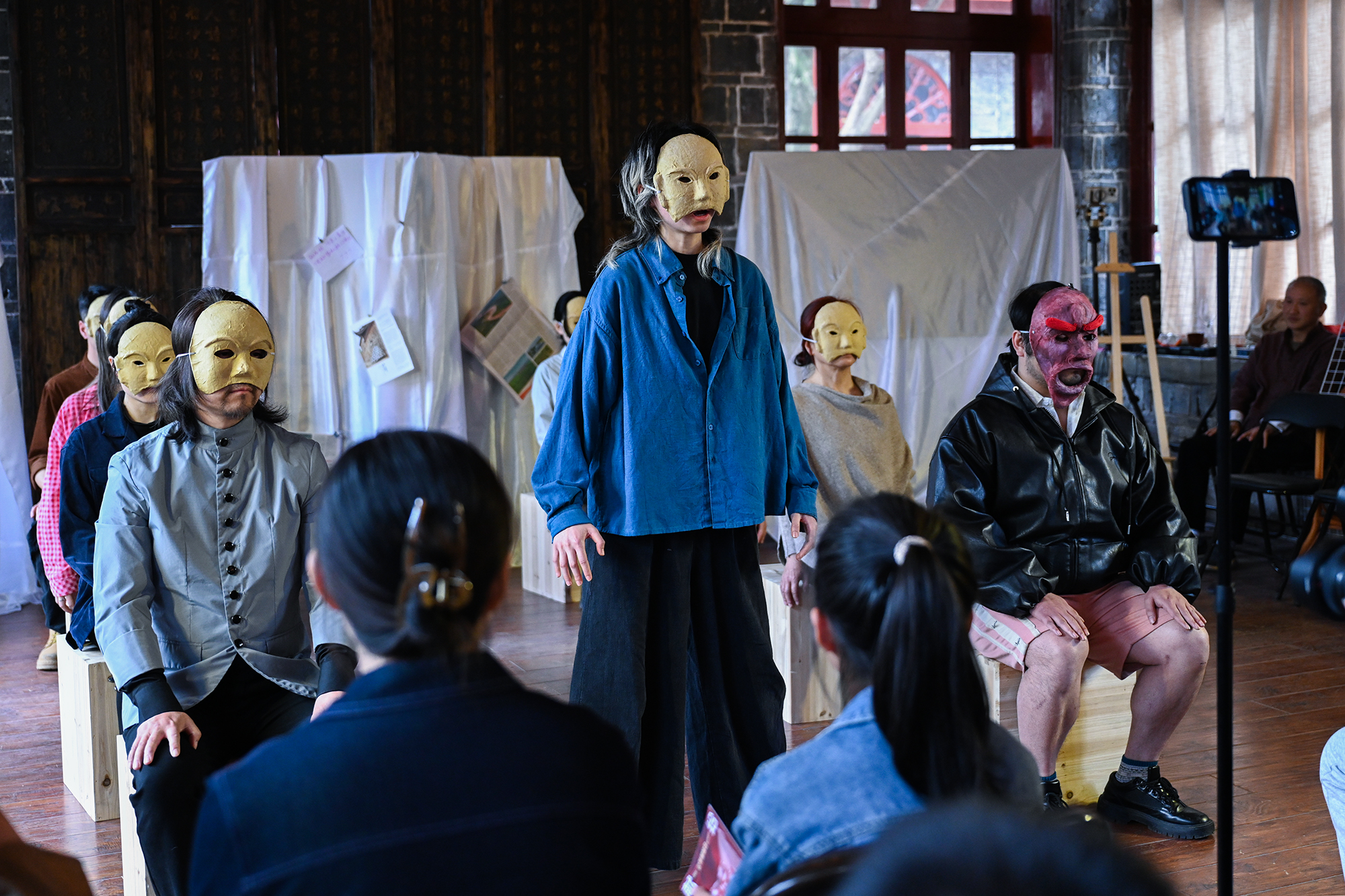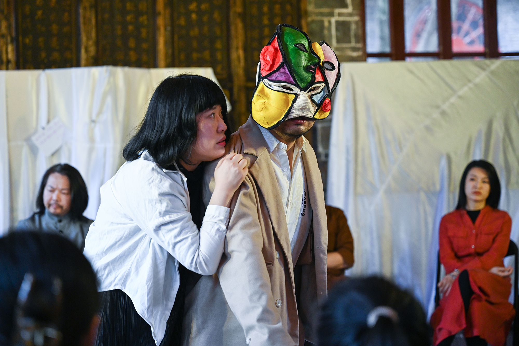 陈长兴的好友们在餐厅讨论那场戏,四位戴着面具的演员,是数十位过场角色的抽象替代,更是台上人物内心世界的“外化”投射。李星瑶在交流环节解释了这一设计背后的专业背景:戏剧治疗。