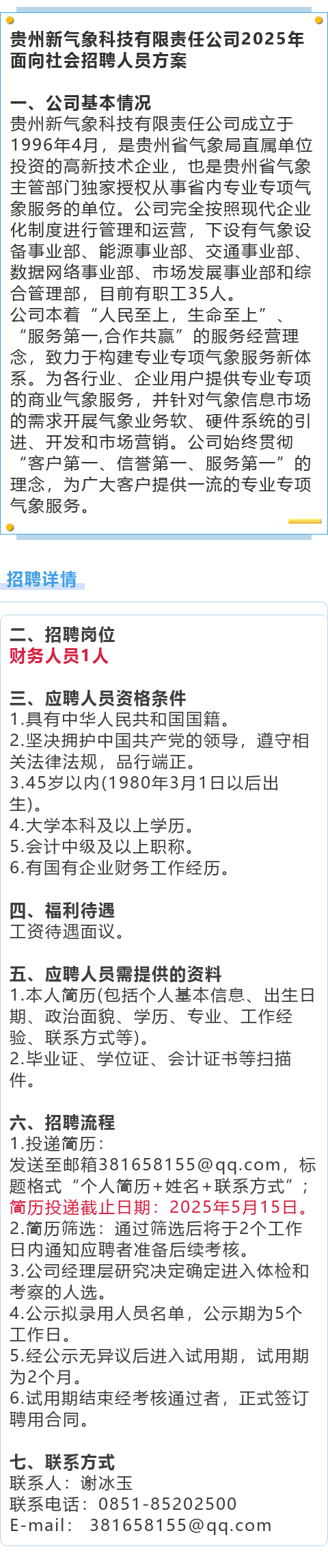 【国企】贵州新气象科技有限责任公司招聘!报名截止时间:5月15日!