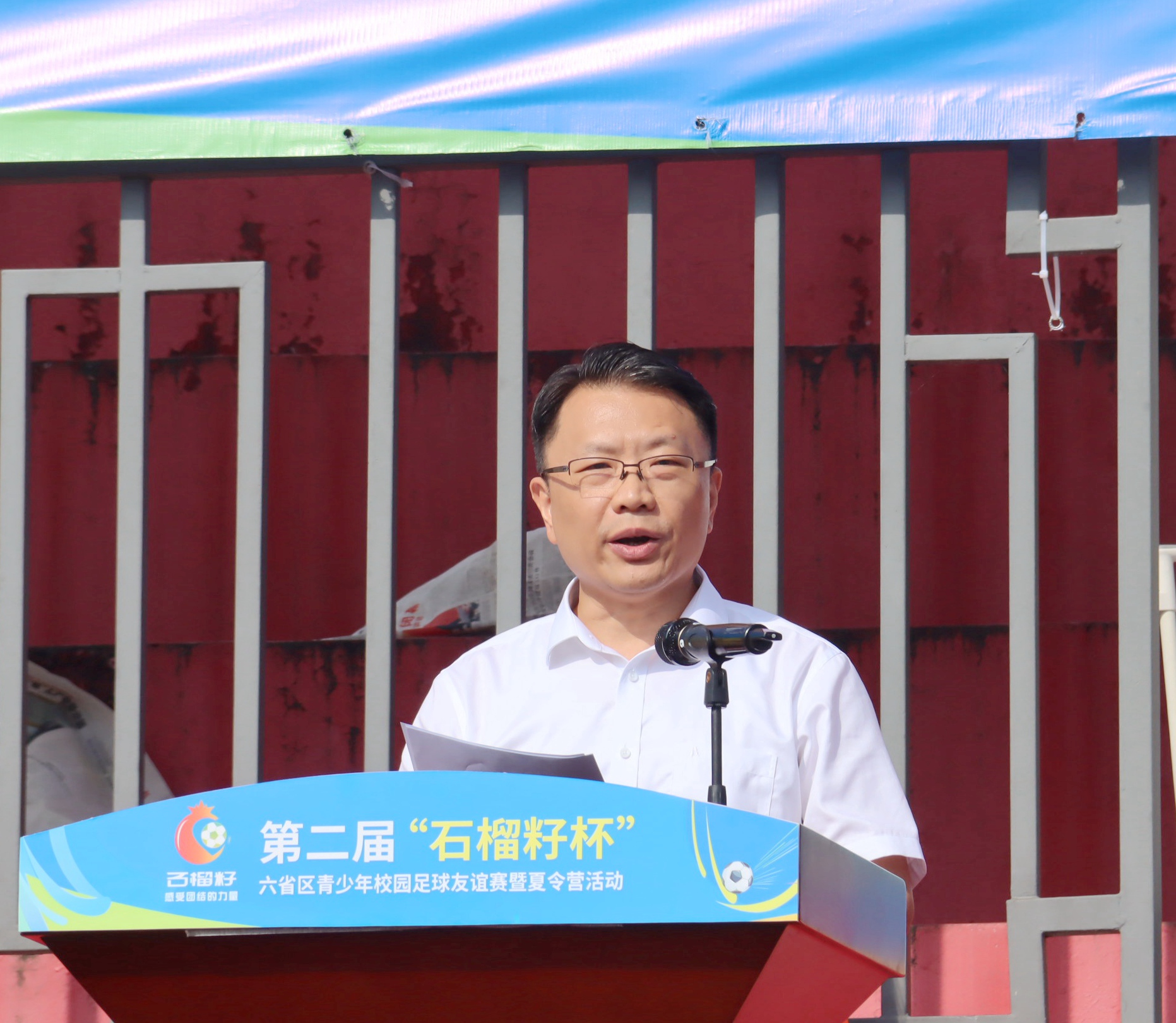 近日,第二届“石榴籽杯”六省区青少年校园足球友谊赛暨夏令营在贵州省贵阳市云岩区中天中学(未来方舟校区)开幕。贵州省人民政府副秘书长、粤黔协作工作队临时党委书记、领队肖南龙,广东省委教育工委委员、省教育厅党组成员、副厅长冯伟,贵州省委教育工委副书记李军等领导出席,与来自广东、广西、西藏、新疆及新疆生产建设兵团的六支代表队运动员、教练员、裁判员及观众共同见证开幕。开幕式由贵阳市云岩区委常委、区政府常务副区长王国鉴主持。