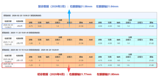 经过8个月的科学干预,2026年2月复查传来好消息:睿睿右眼眼轴降至21.56mm,左眼眼轴降至21.64mm,双眼眼轴实现“逆向回退”。在儿童近视防控领域,眼轴年增长控制在0.2mm以内已是理想目标,而睿睿在8个月内实现眼轴回退,防控成效远超预期,成为早期干预、科学防控的有力例证。