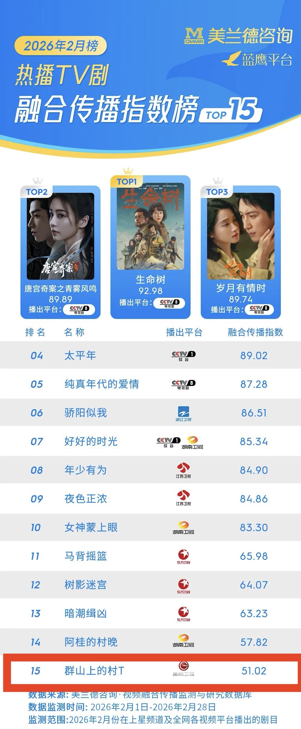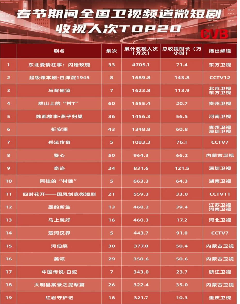 2026年春节档,聚焦于贵州非遗与民族文化的微短剧《群山上的“村T”》悄然破圈,该剧通过贵州卫视与爱奇艺平台联动上线,传播数据进入全国卫视频道微短剧TOP榜单,以1555.4万次累计收视人次位列第四,成为春节档微短剧中的一匹“文化黑马”。