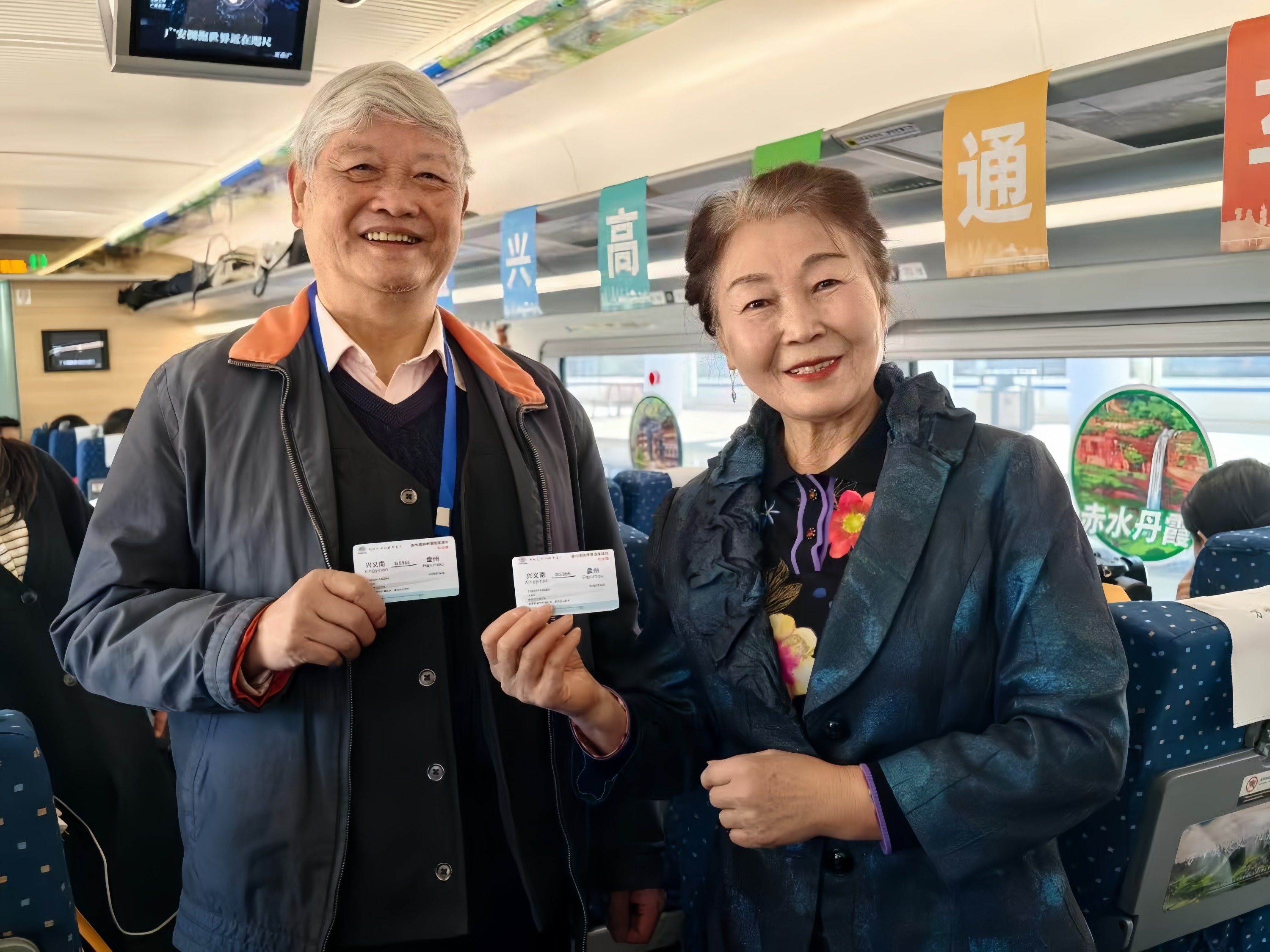 On November 28, 2025, the Panzhou–Xingyi High-Speed Railway officially opened. At dawn, the inaugural train departed from Xingyi toward Panzhou, its carriages clean and bright, the mountains unfurling outside the windows. Sitting by the window were Zhou Hongbin and Xu Jiyou, retired employees of the Chengdu Railway Bureau's Guiyang Service Section. Learning that Guizhou's last prefecture-level city had finally entered the high-speed rail era, the couple—who had just celebrated their golden wedding anniversary—insisted on riding the first train. For them, this journey was more than a ride, it felt like a meaningful closure to the decades they had devoted to China's railways.
