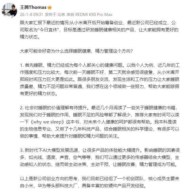 跟大家汇报下最近的情况:从小米离开后开始筹备创业,最近新公司已经成立,公司取名为“今日宜休”,目标是通过研发睡眠健康相关的产品,让大家能拥有更好的精力状态。