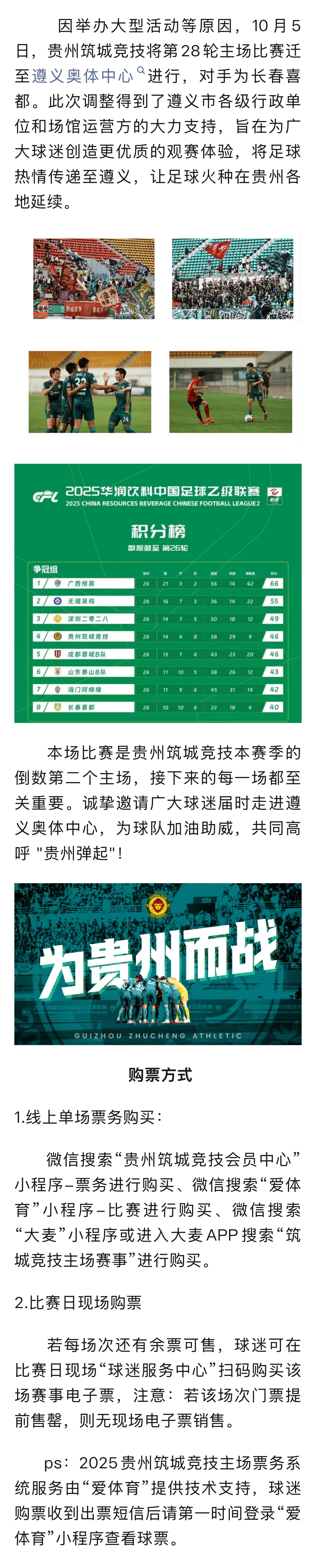 赛事预告|贵州筑城竞技对阵长春喜都比赛将于10月5日在遵义奥体开赛