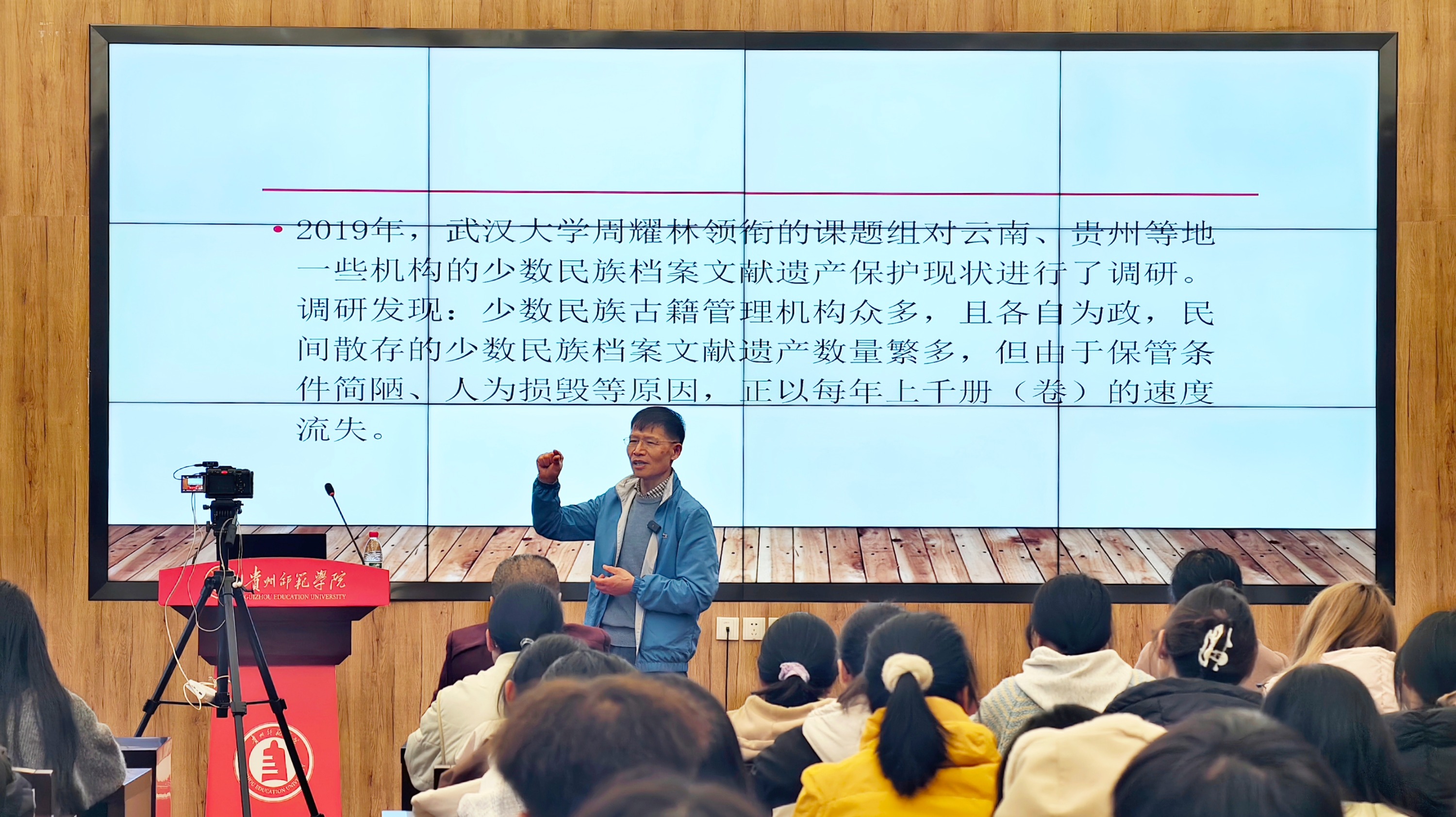 “古籍,是中华文化的‘基因库’。”活动开场,贵州师范学院历史与档案学院院长万国崔在致辞中这样说。他希望同学们以敬畏之心走近古籍,以专业之力深入研习,更以切实的行动激发文化活力,“让养在深闺的民族古籍,走入现代生活,成为滋养大众精神的文化养分。”