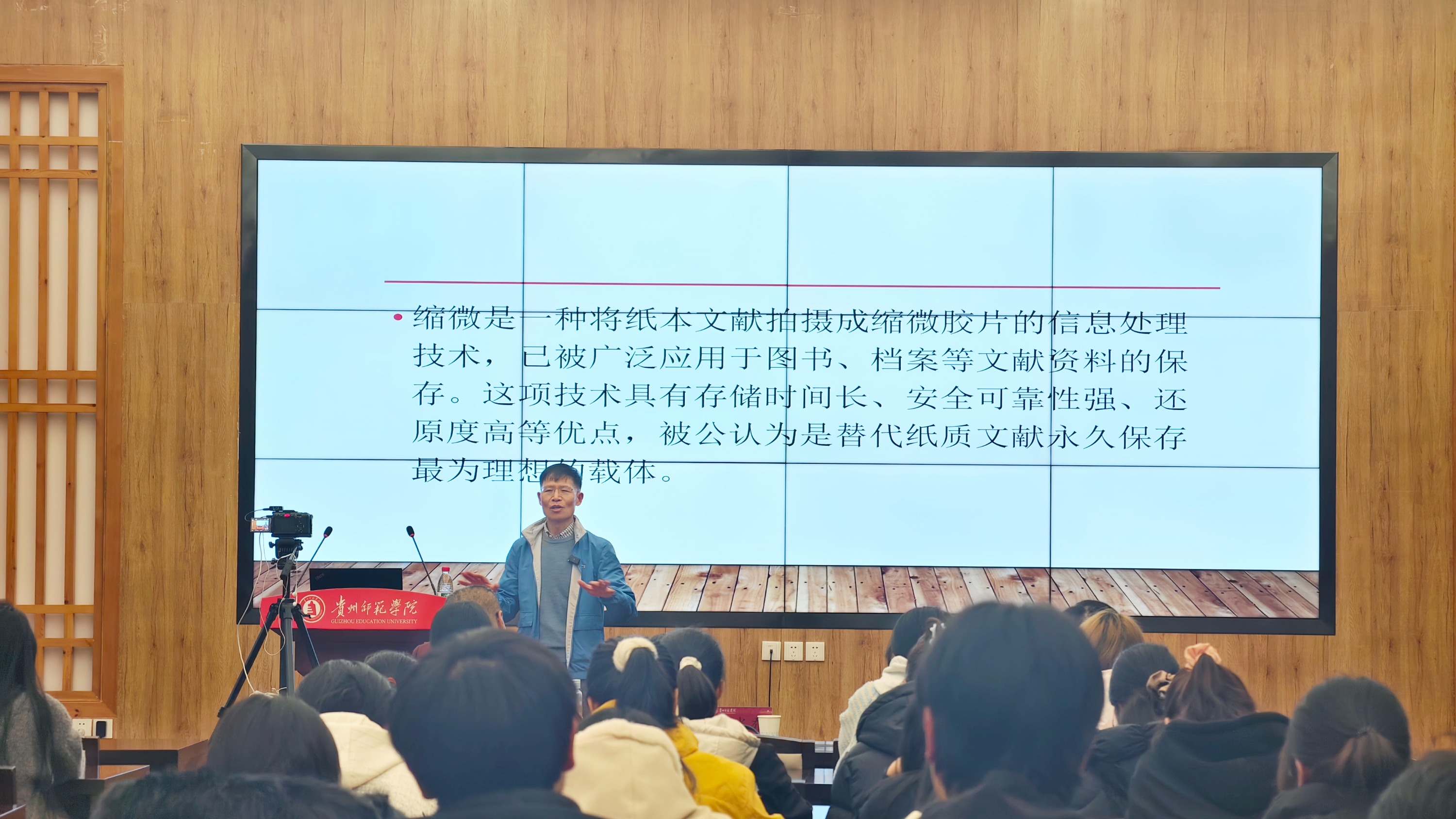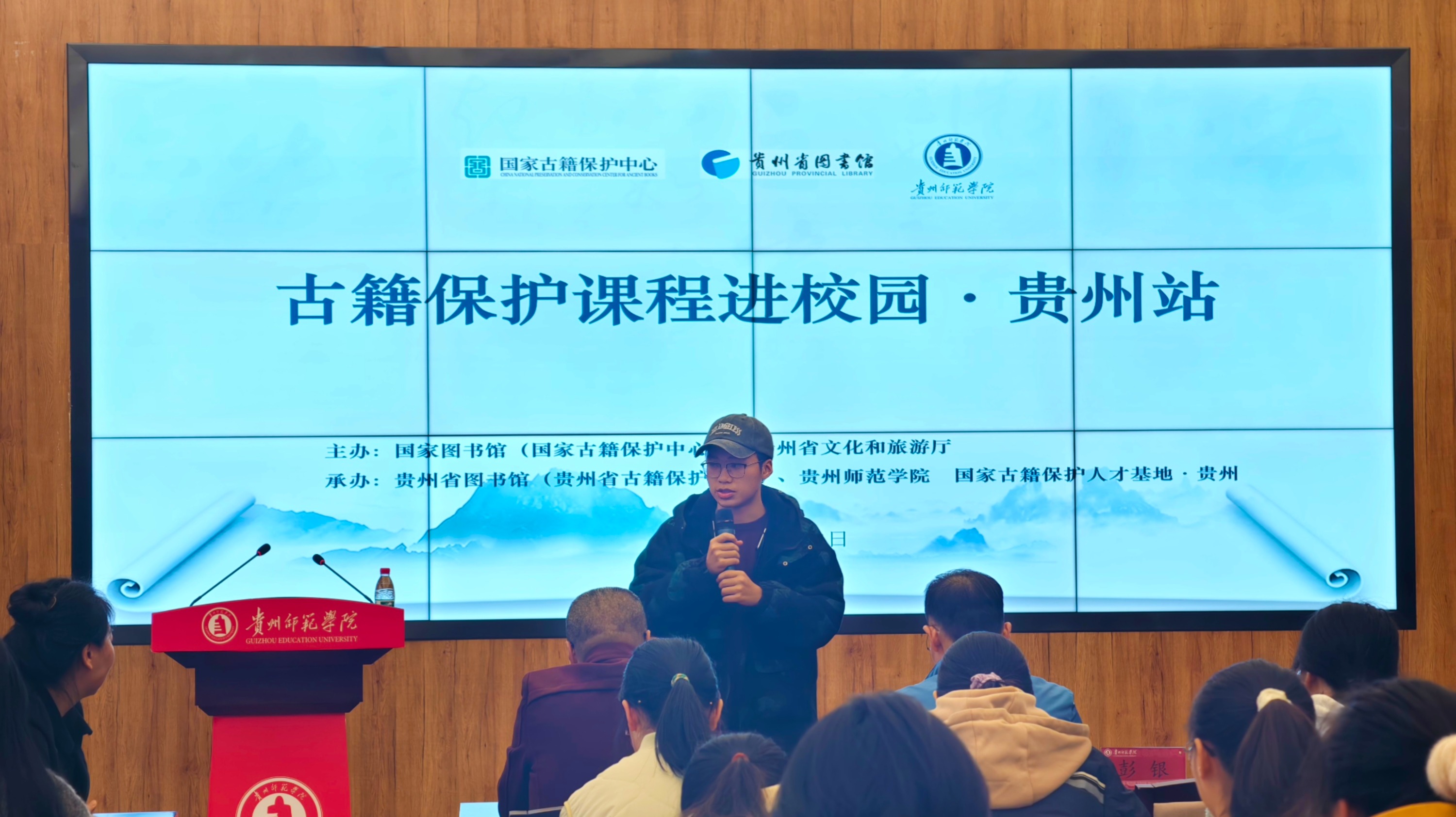 12月4日,全国“古籍保护课程进校园·贵州站”走进贵州师范学院。现场座无虚席,来自贵州省图书馆、云南大学的专家学者与师生齐聚一堂,共同参与这场以古籍保护为主题的文化活动。本次活动由国家图书馆(国家古籍保护中心)、贵州省文化和旅游厅主办,贵州省图书馆、贵州师范学院、国家古籍保护人才培训基地(贵州)承办。