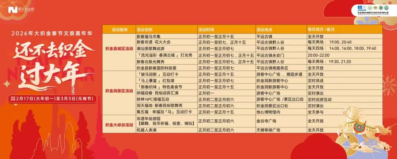 一场景城联动、全城沉浸的“马年新春文旅盛宴”即将在贵州中部的小城织金拉开序幕,织金县向全国人民喊出一句响亮又亲切的邀请:“还不去织金过大年?”