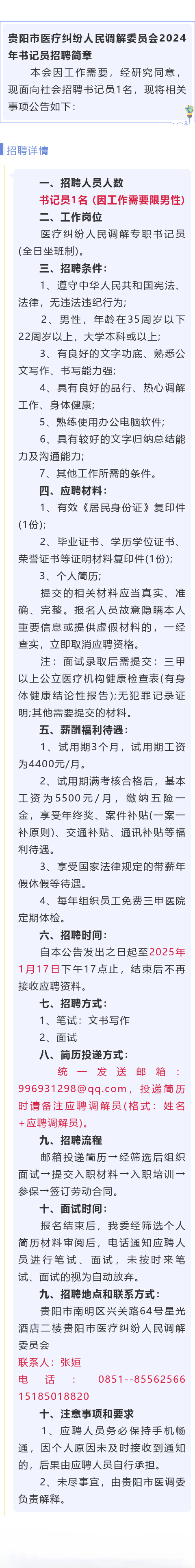 贵阳市医疗纠纷人民调解委员会招聘!试用期月薪4400元!