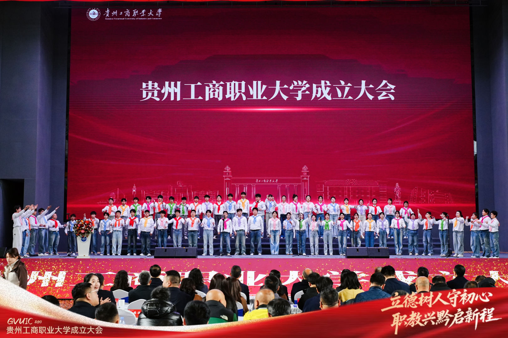 在与会嘉宾的共同见证下,贵州工商职业大学正式揭牌。从学院到大学,不仅是校名的更迭,更是办学层次的飞跃、使命责任的升级。晨曦合唱团以一曲《启航》为学校献礼,歌声嘹亮,唱响职教兴黔的美好愿景。