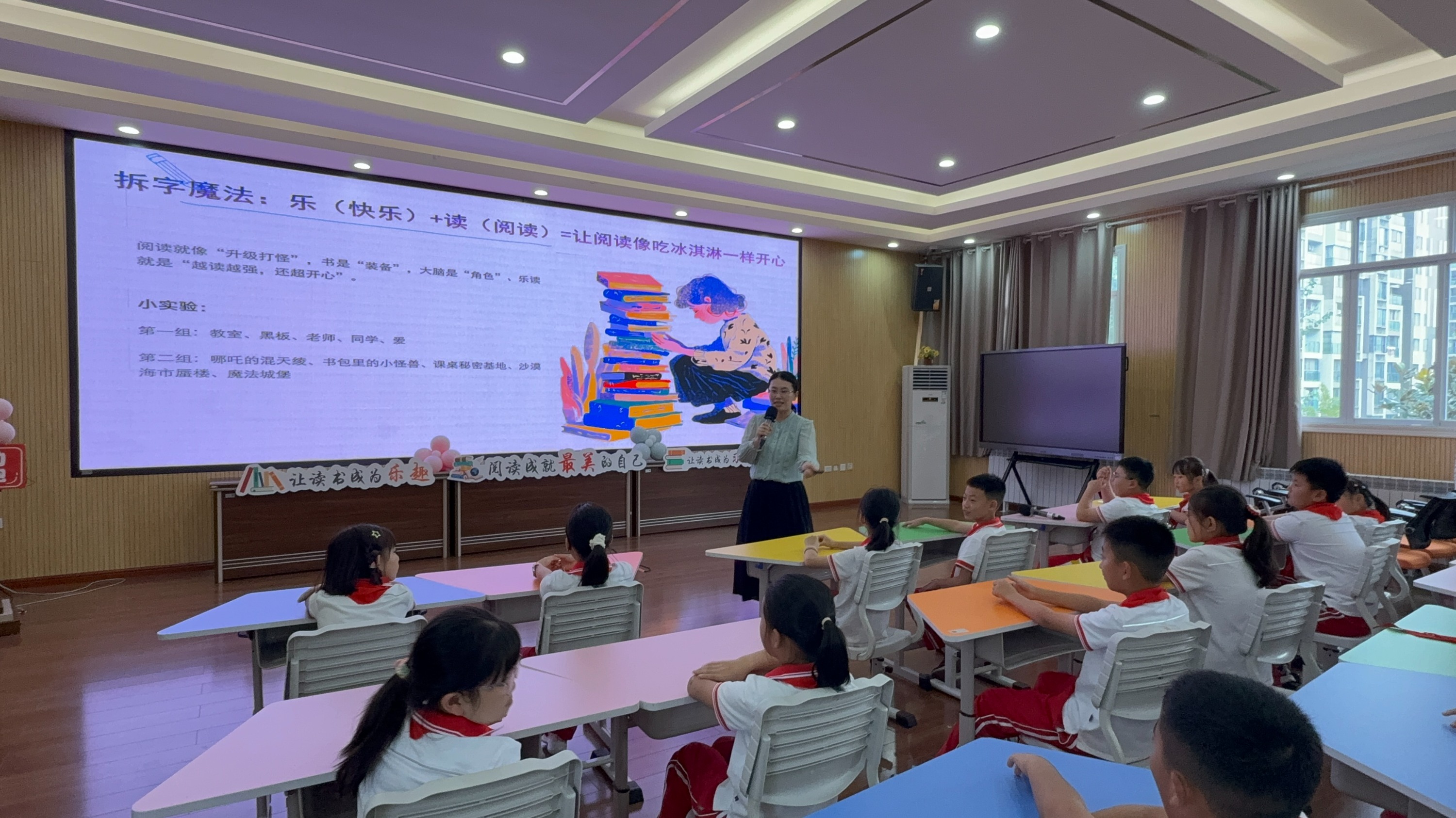 首先是学生们充满童真与思考的主题分享“如果我当老师,如何助力孩子们乐读”。孩子们化身“小老师”畅所欲言,从建立阅读积分制,到组建班级共读圈;从精心设置宽广舒适、氛围温馨的阅读角,到根据每位同学的兴趣爱好个性化推荐书籍……他们既关注阅读环境的营造,又注重阅读过程的体验感,提出了许多富有创意且切实可行的“金点子”。有的还将读书比作美味的冰淇淋,强调“选对书”是第一步的甜蜜。此外,“故事小主播”讲述精彩片段、“角色小剧场”演绎书中人物、“阅读寻宝会”抽奖激发探索欲等建议,充分展现了孩子们对“乐读”的独特理解和无限期待。