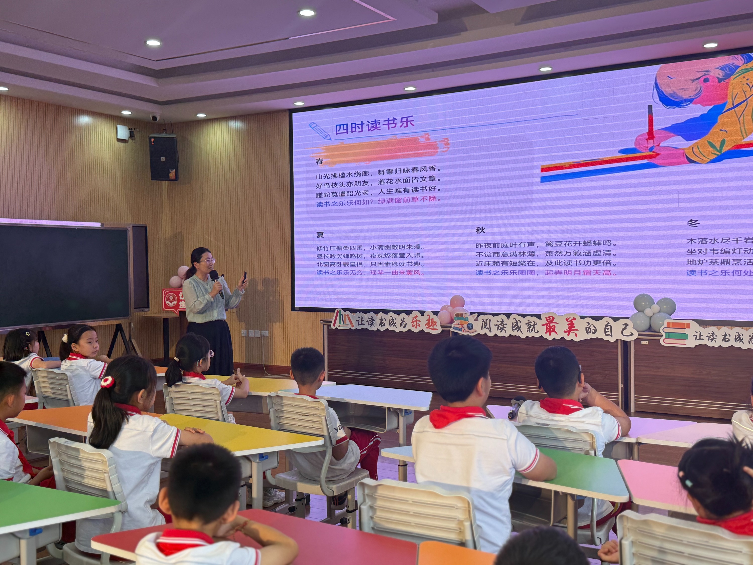 最后,宋青老师带领现场学生共读《四时读书乐》,优美的诗句和深刻的意蕴让在场所有人沉浸在四季读书的不同乐趣之中。同时也强调了培养“阅读习惯、运动习惯、礼仪习惯”在生活中的重要性,能够有效促进孩子们的全面发展。