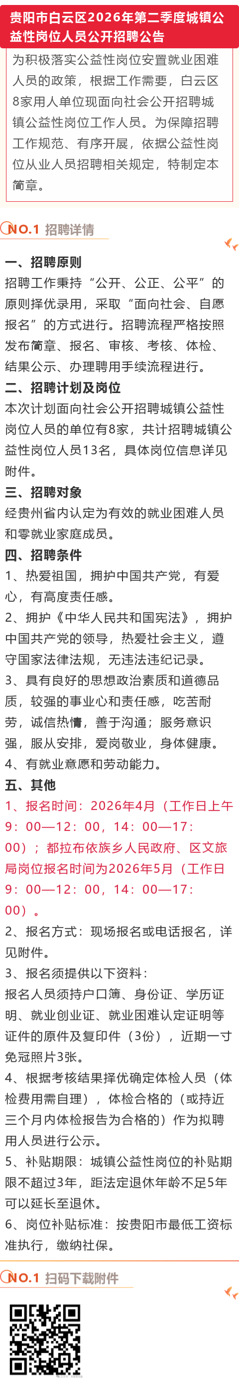 贵阳市白云区2026年第二季度城镇公益性岗位人员公开招聘公告!