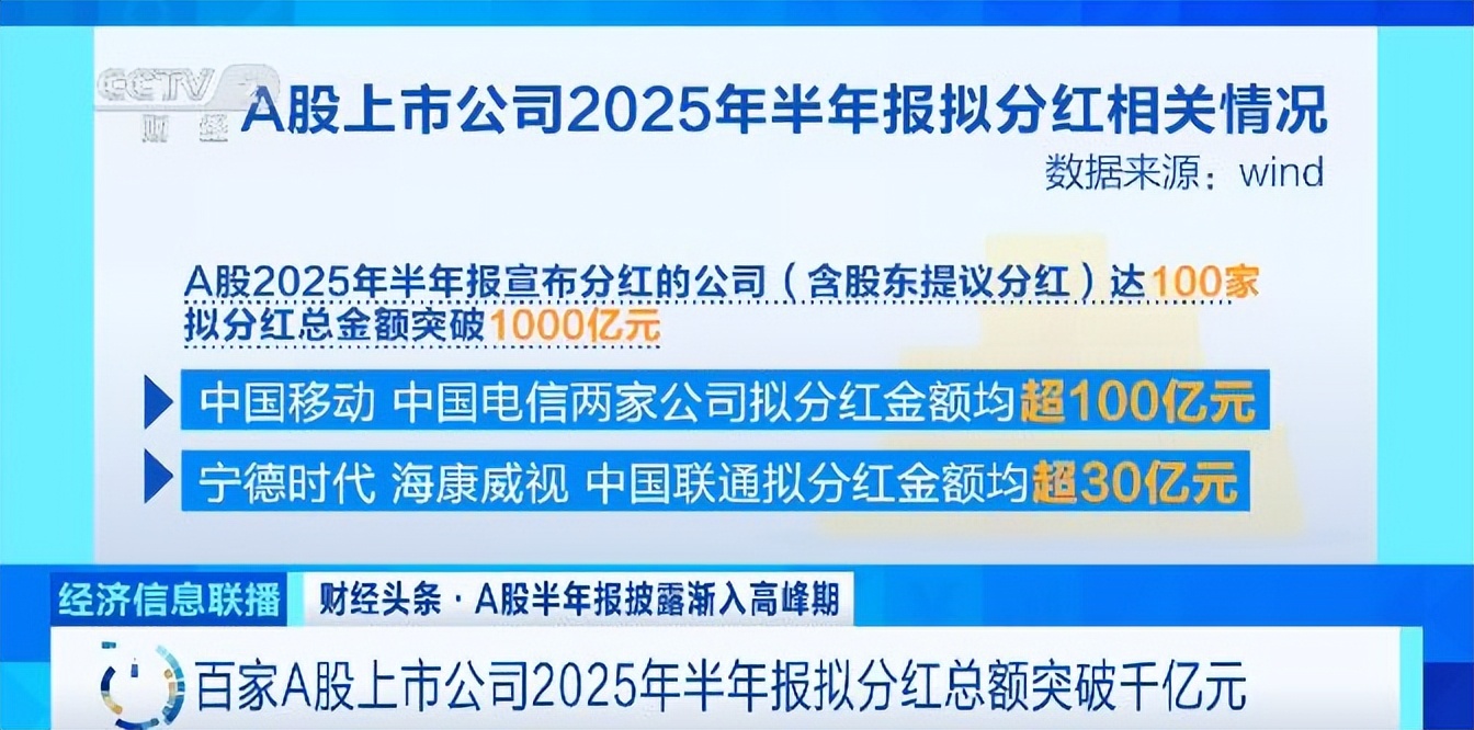 目前,A股2025年半年报宣布分红的公司(含股东提议分红)达100家,拟分红总金额突破1000亿元。其中,中国移动、中国电信两家公司拟分红金额均超100亿元;宁德时代、海康威视、中国联通拟分红金额均超30亿元。