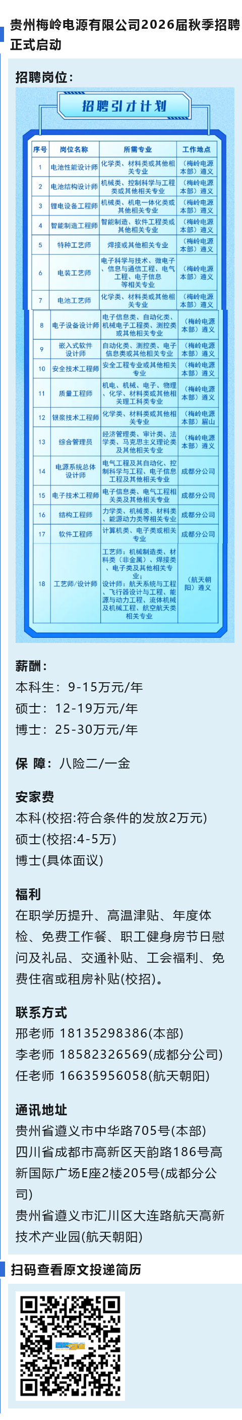 【国企】贵州梅岭电源有限公司18岗招聘!年薪9-30万元+各类福利待遇!