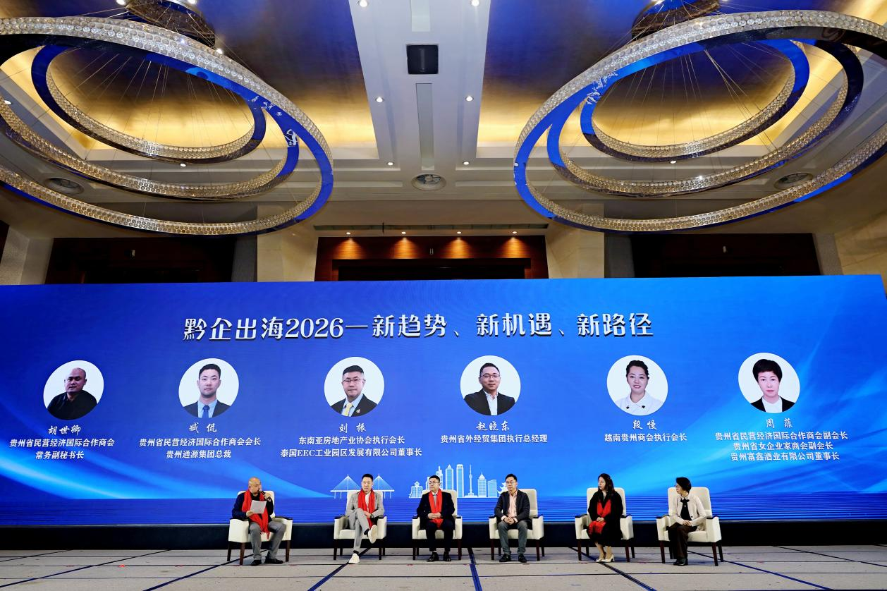 年会特设“黔企出海2026:新趋势、新机遇、新路径”圆桌对话环节。贵州省外经贸集团执行总经理赵晓东、贵州省民营经济国际合作商会会长臧侃、东南亚房地产业协会执行会长刘振、越南贵州商会执行会长段慢、贵州省民营经济国际合作商会副会长周菲五位嘉宾,围绕国际经贸格局演变、“一带一路”合作机遇、区域市场特征及企业出海实操等关键议题展开深度交流。