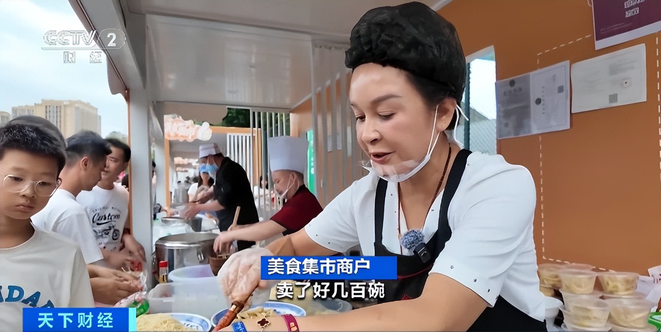 美食集市商户:卖了好几百碗了。今天的收入肯定比较好,比较可观。