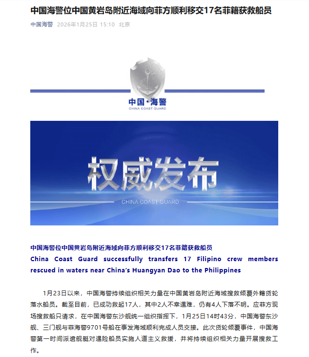 1月23日以来,中国海警持续组织相关力量在中国黄岩岛附近海域搜救倾覆外籍货轮落水船员。截至目前,已成功救起17人,其中2人不幸遇难,仍有4人下落不明。应菲方现场搜救船只请求,在中国海警东沙舰统一组织指挥下,1月25日14时43分,中国海警东沙舰、三门舰与菲海警9701号船在事发海域顺利完成人员交接。此次货轮倾覆事件,中国海警第一时间派遣舰艇对遇险船员实施人道主义救援,并将持续组织相关力量开展搜救工作。