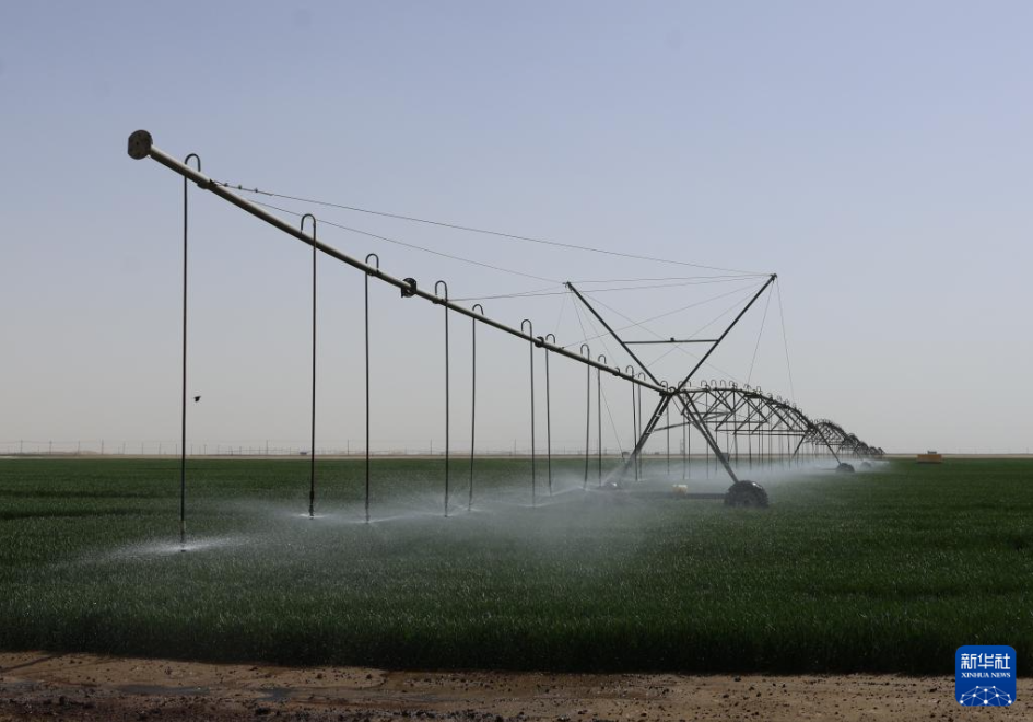 新疆生产建设兵团第十四师昆玉市玉园镇紧邻塔克拉玛干沙漠,目前,该镇的冬小麦正拔节生长。据介绍,玉园镇于2025年引进指针式智能喷灌机,有效提高了节水效率、节约了人工成本。新华社记者 贾钊 摄