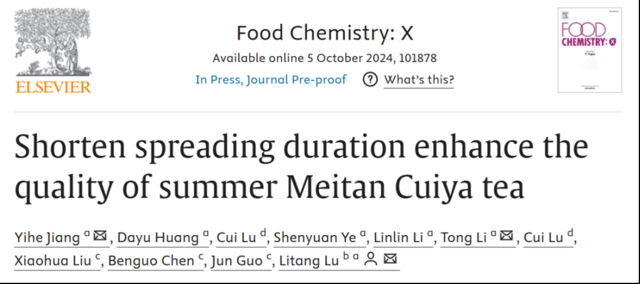 近期,贵州大学吕立堂教授课题组在《Food Chemistry: X》上在线发表了题为“Shortening Spreading Duration Enhances the Quality of Summer Meitan Cuiya Tea”的研究论文。该研究结合转录组学和代谢组学,揭示了摊青时间对夏季MTCY品质提升的重要作用,为提高夏季MTCY品质提供了理论依据。