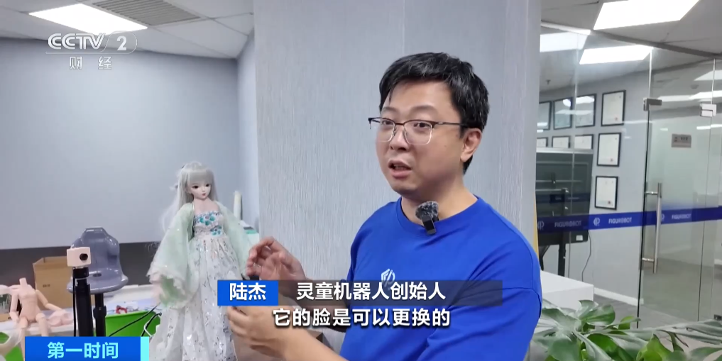 灵童机器人创始人 陆杰:它的脸、头发、衣服都是可以更换的。换了头发、衣服、脸之后就换了一个IP。同时我们给它赋能了一个智能化的AI“灵魂”。可以设置“话痨”程度,甚至还可以给它置入剧本,它可以按照剧本进行内容的交互。我们现在正在筹备一条5万台产能的生产线,差不多在12月底可以正式交付第一批量产的机器。